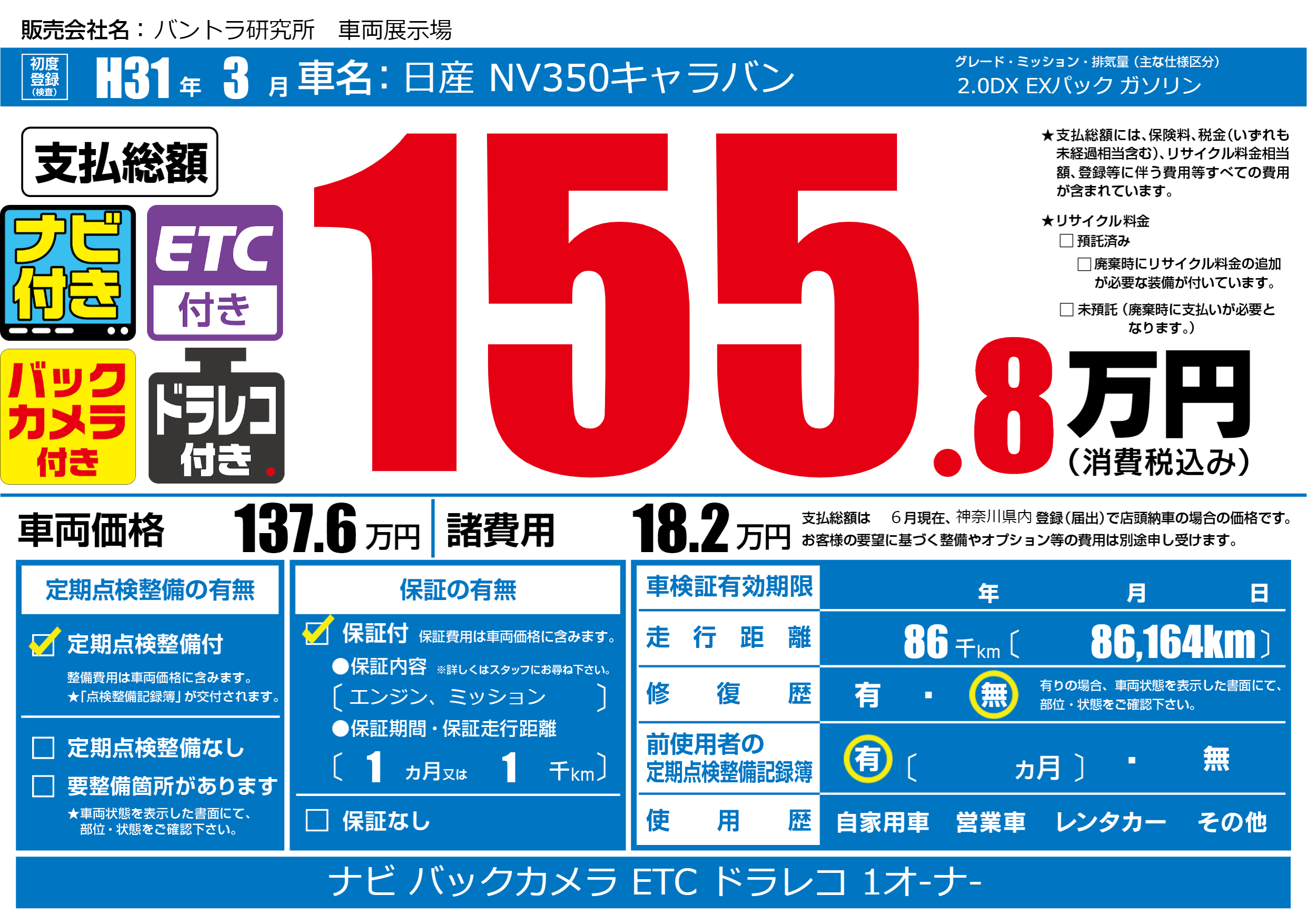 | 車名 | 日産 NV350キャラバン | グレード ミッション 排気量 |