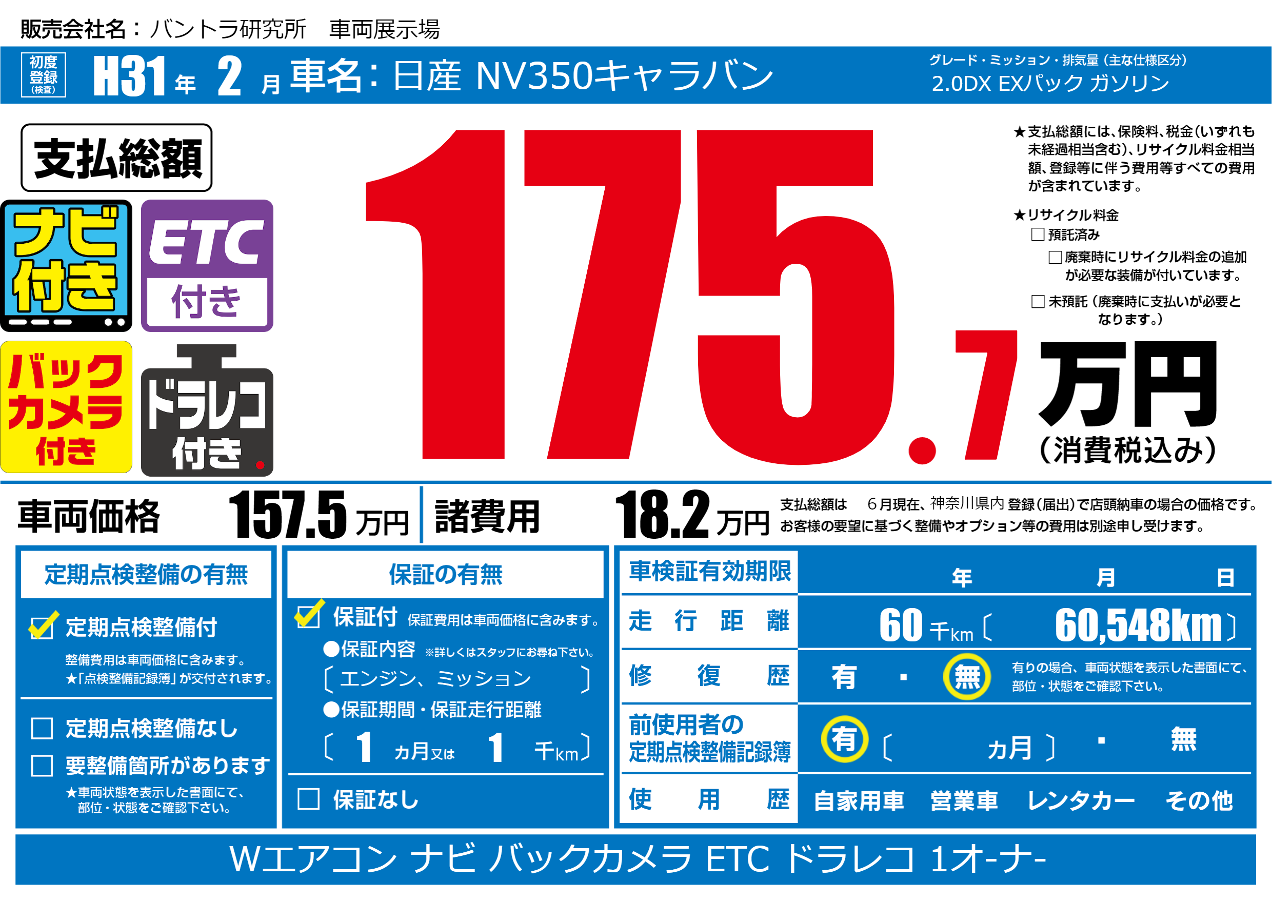 | 車名 | 日産 NV350キャラバン | グレード ミッション 排気量 |