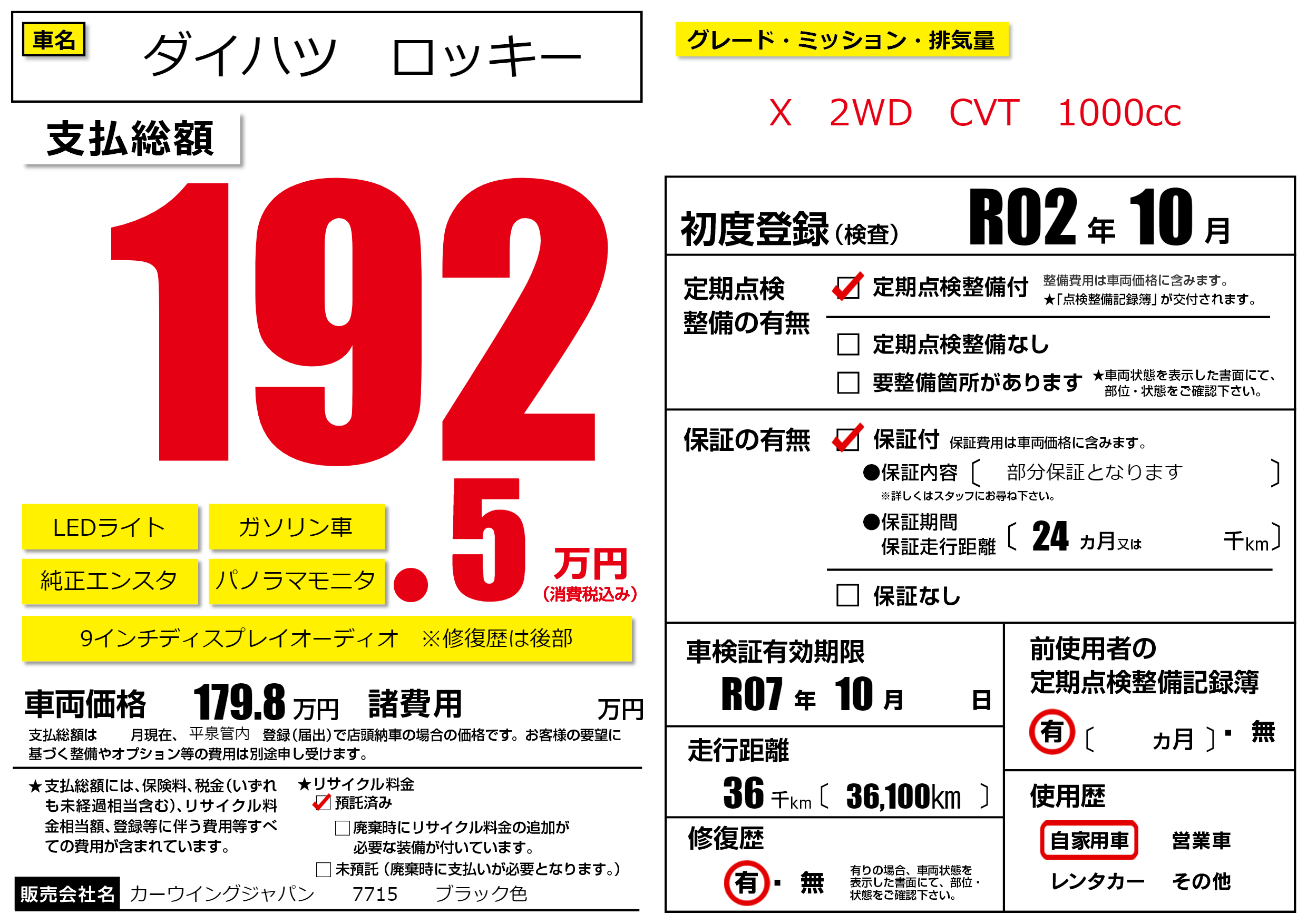 | 車名 | ダイハツ ロッキー | グレード ミッション 排気量 |