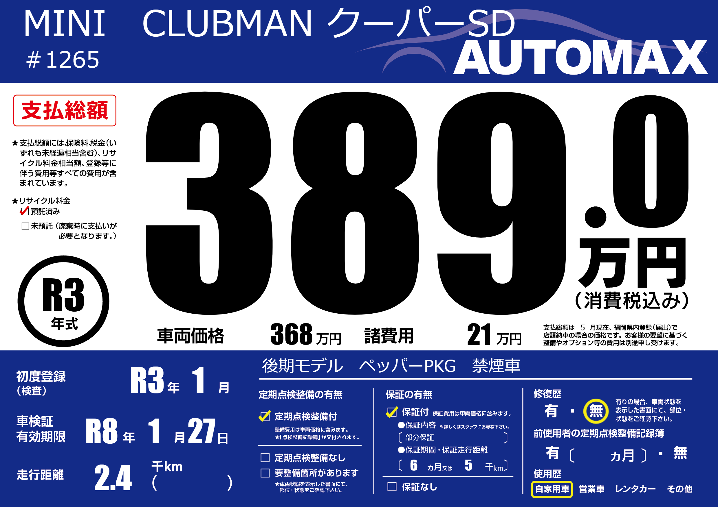 | 車検制限 | R8年 1月 27日 | ||