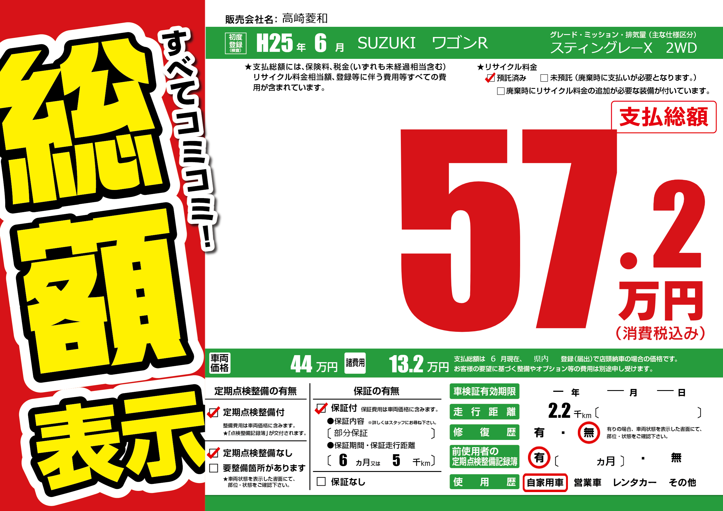 | 車名 | SUZUKI ワゴンR | グレード ミッション 排気量 |