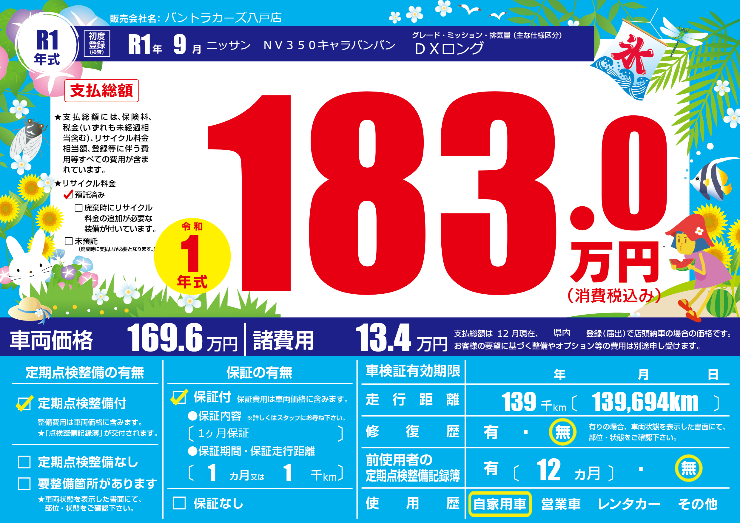 | 走行キロ | 13.9万km | 初年度登録 | R1年9月 |