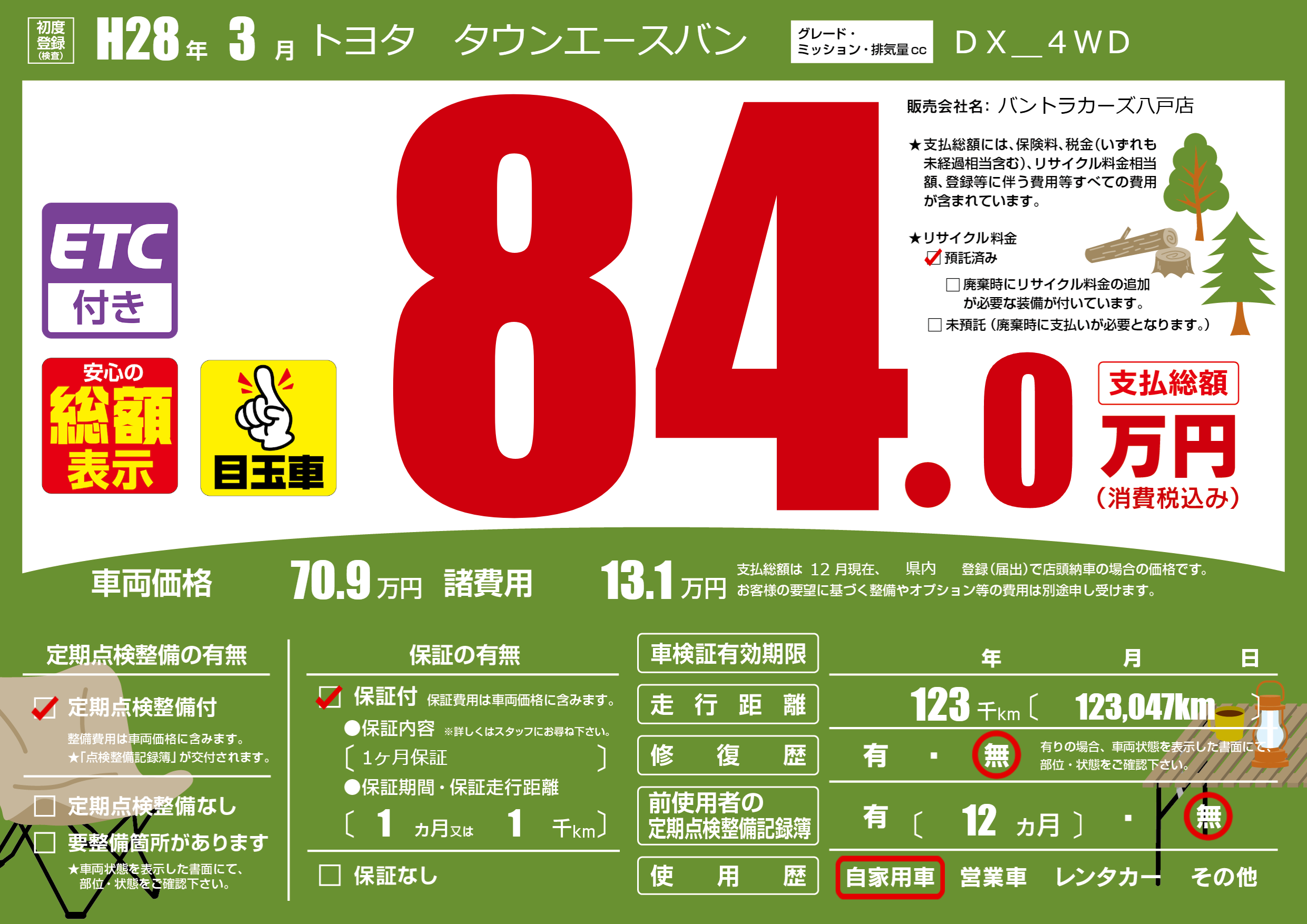 | 走行キロ | 12.3万km | 初年度登録 | H28年3月 |