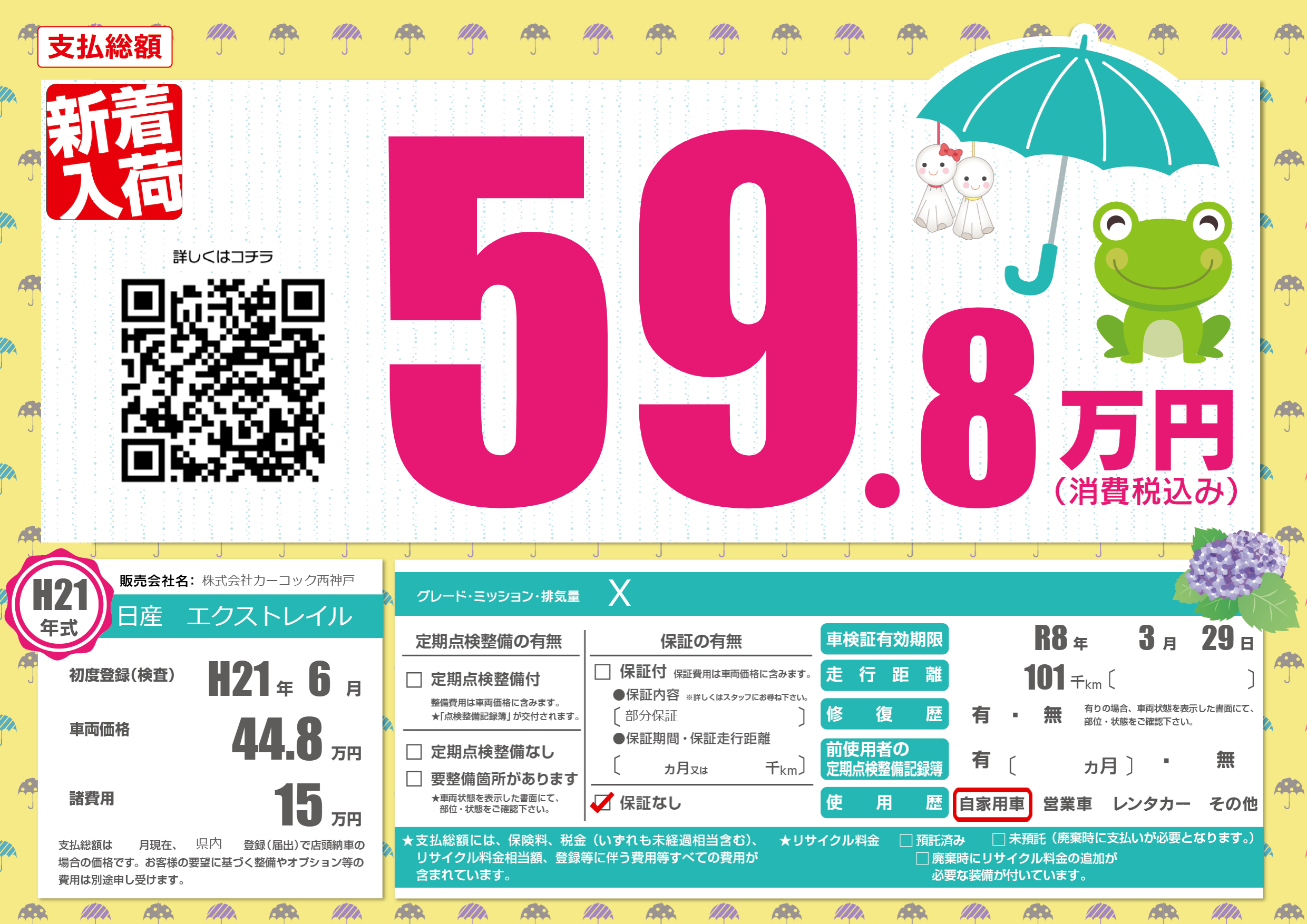 | 走行キロ | 10.1万km | 初年度登録 | H21年6月 |