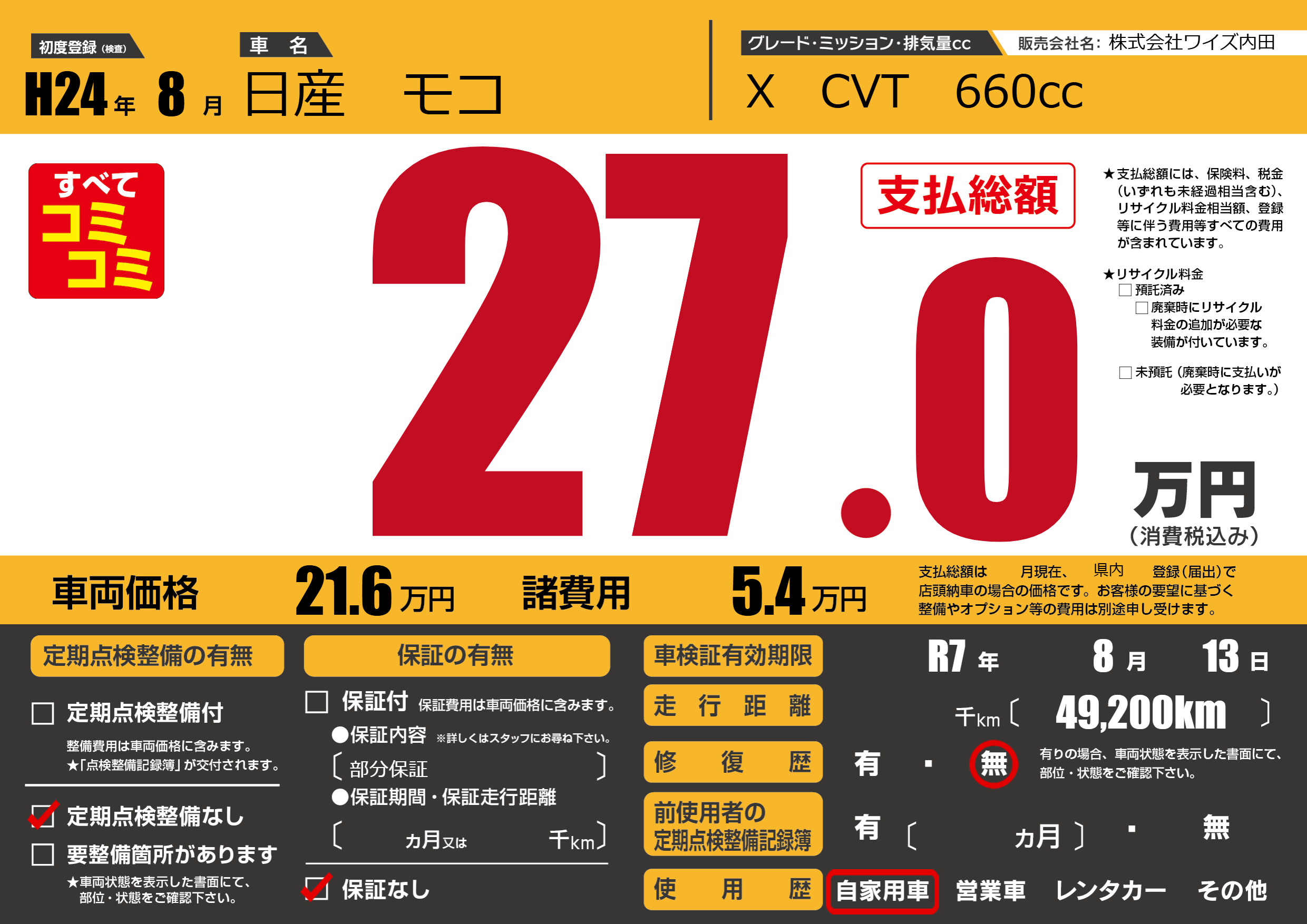 | 走行キロ | - | 初年度登録 | H24年8月 |