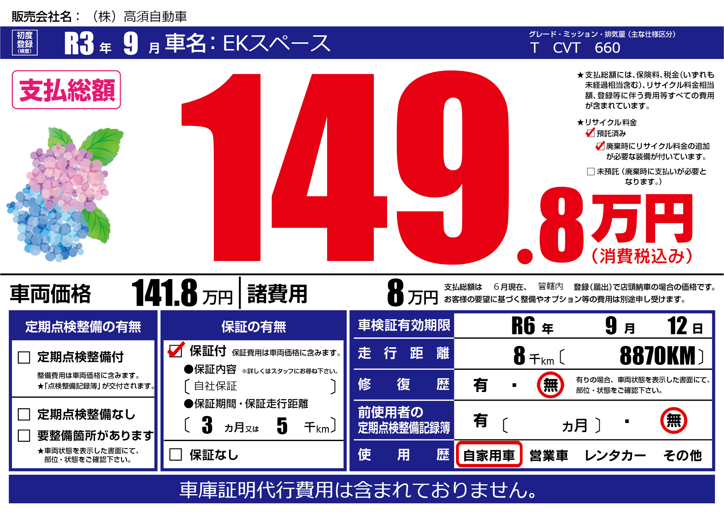 | 走行キロ | 0.8万km | 初年度登録 | R3年9月 |