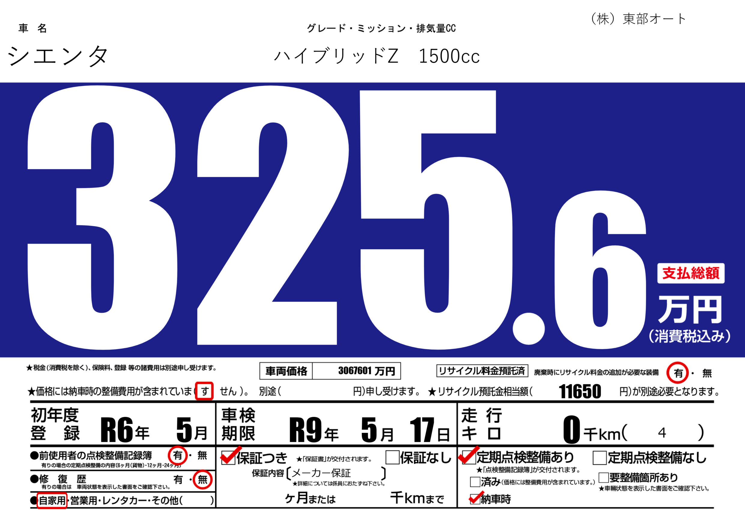 | 車名 | シエンタ | グレード ミッション 排気量 |