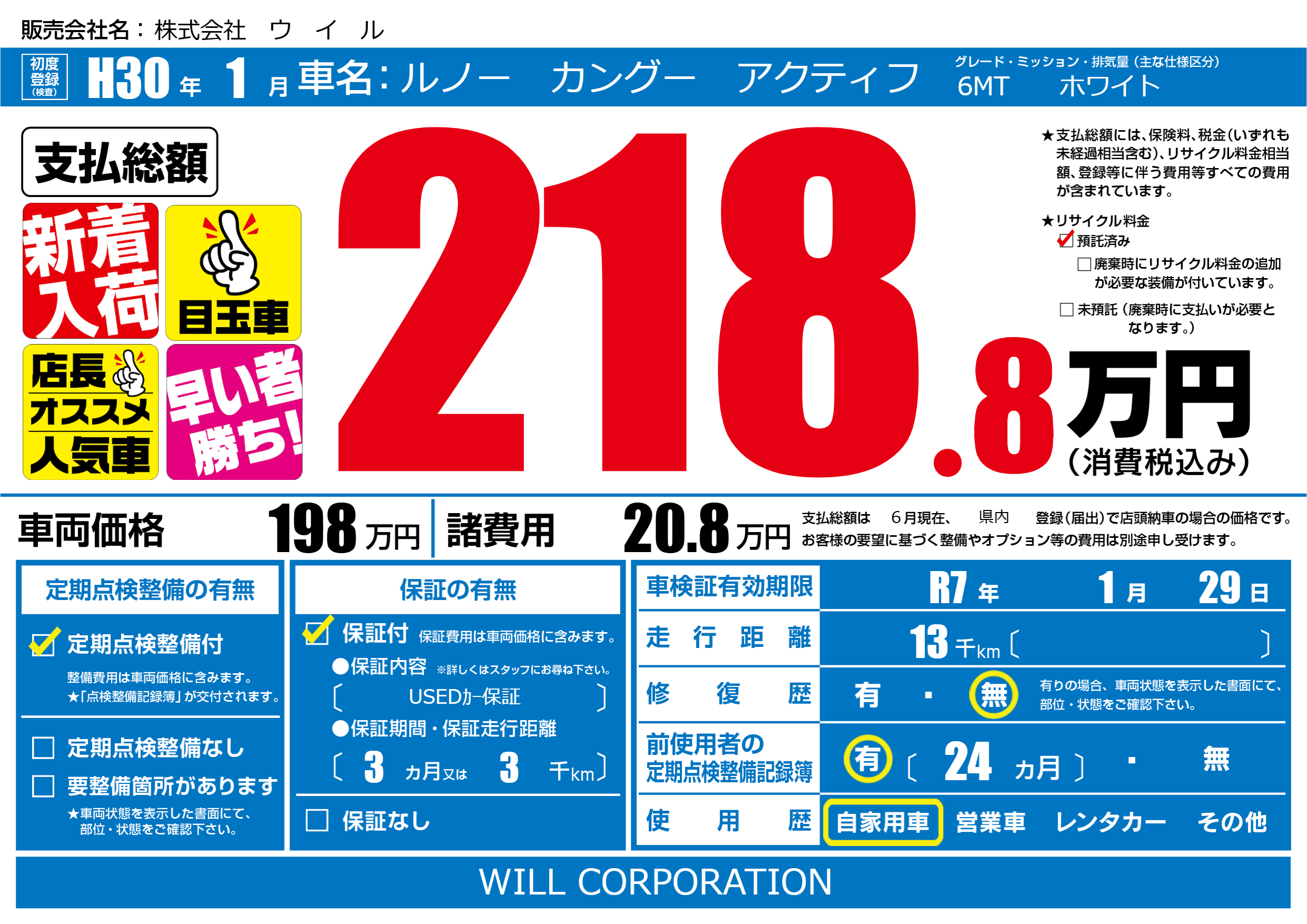| 走行キロ | 1.3万km | 初年度登録 | H30年1月 |