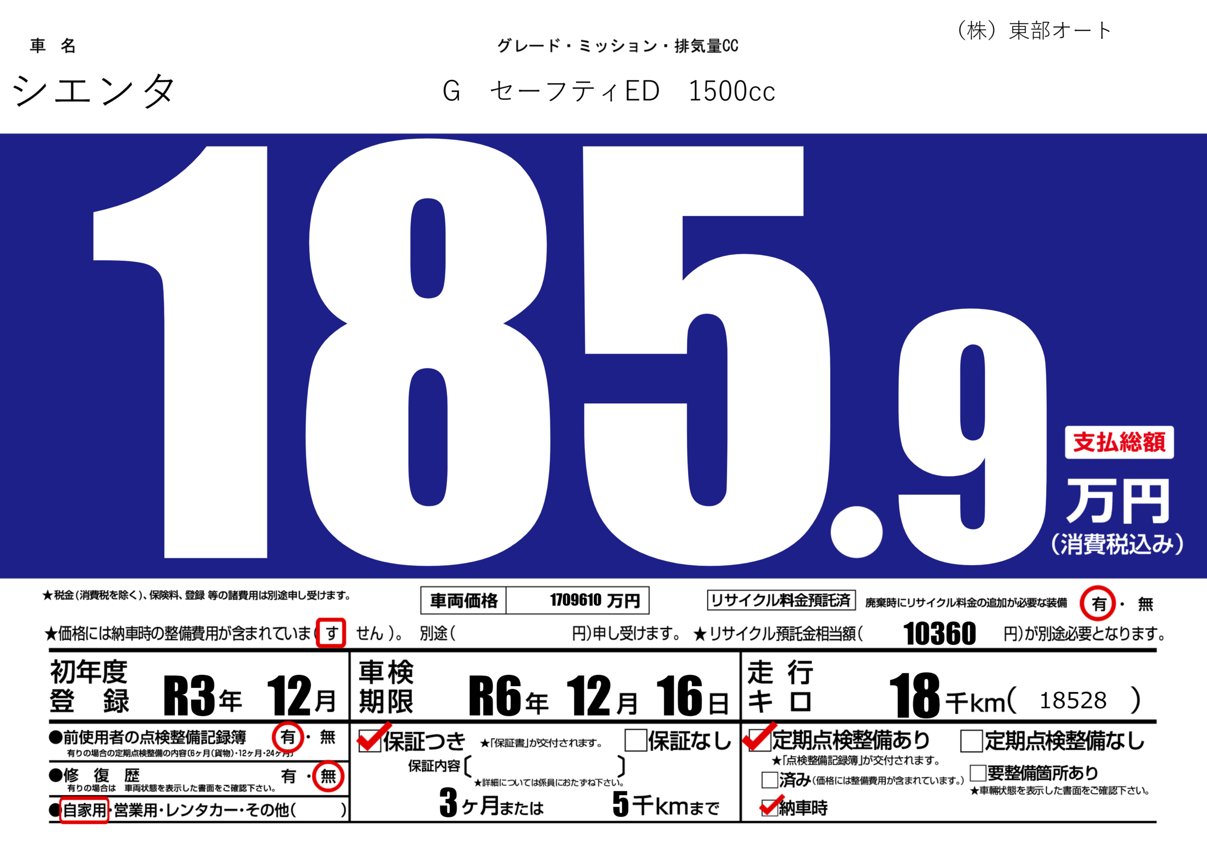 | 車名 | シエンタ | グレード ミッション 排気量 |