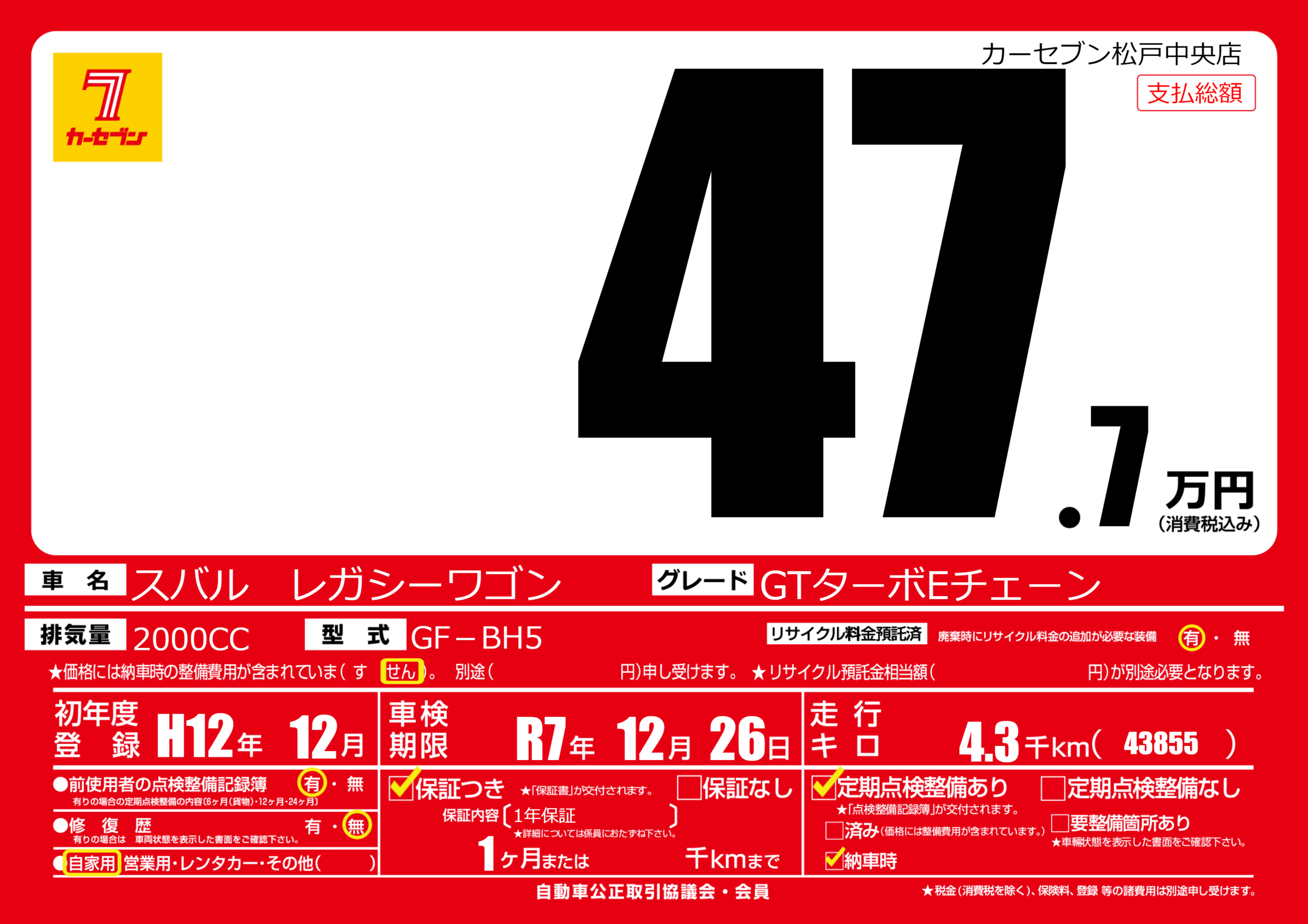 | 車名 | スバル レガシーワゴン | グレード ミッション 排気量 |