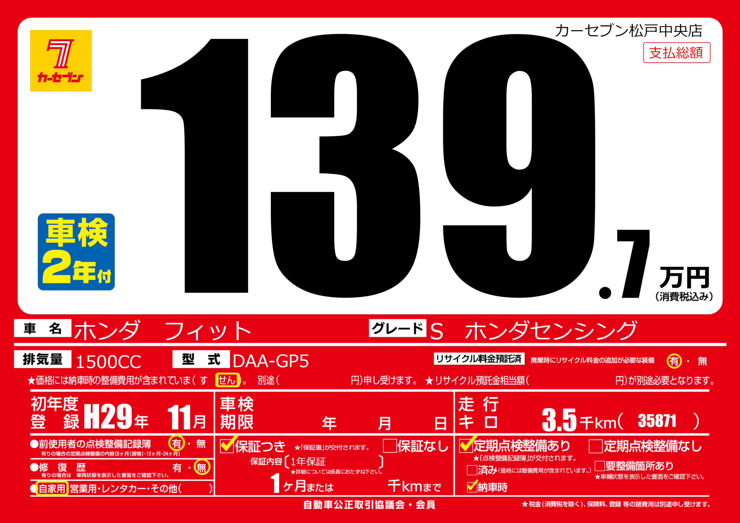 | 走行キロ | 0.3万km | 初年度登録 | H29年11月 |