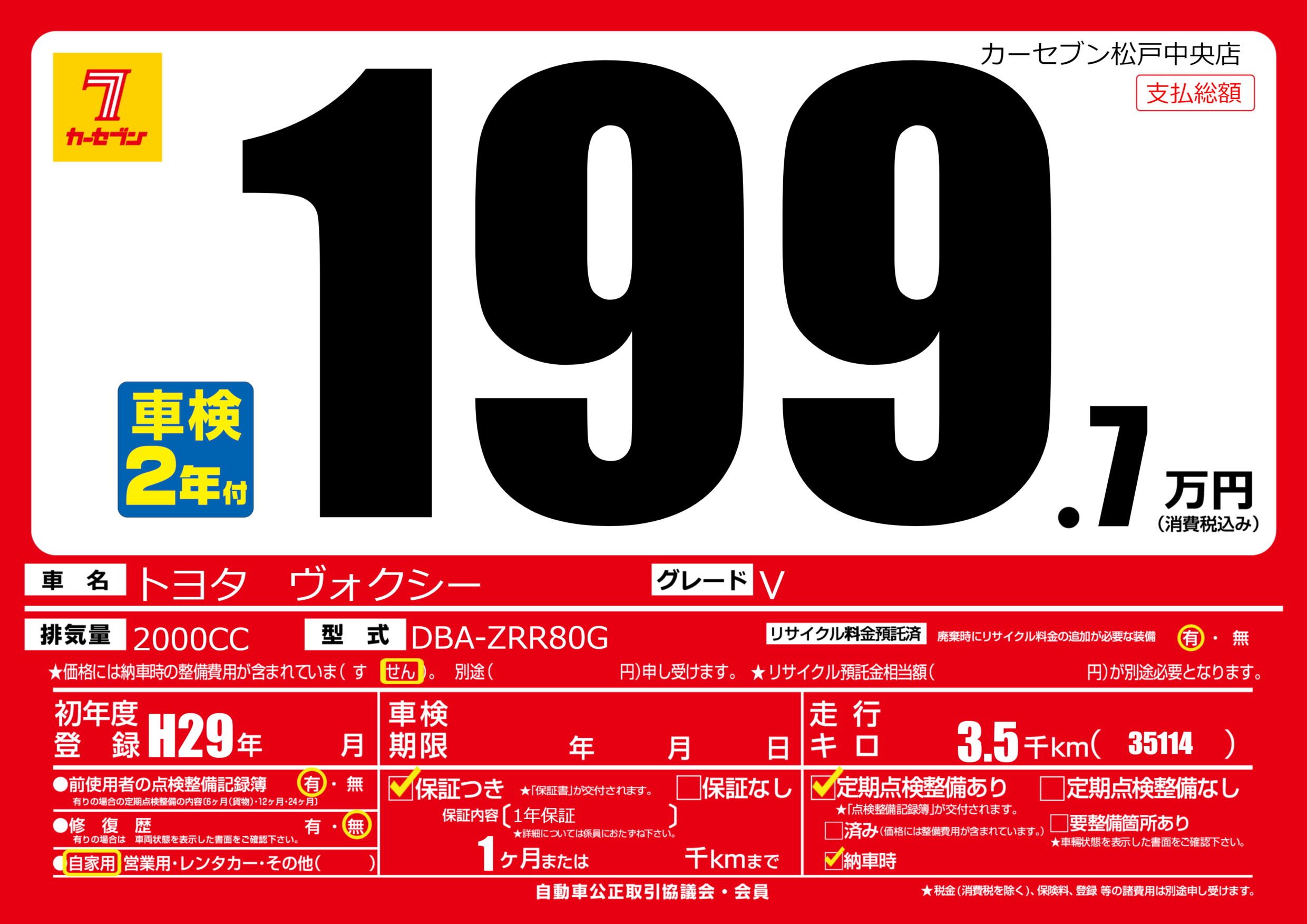 | 車名 | トヨタ ヴォクシー | グレード ミッション 排気量 |