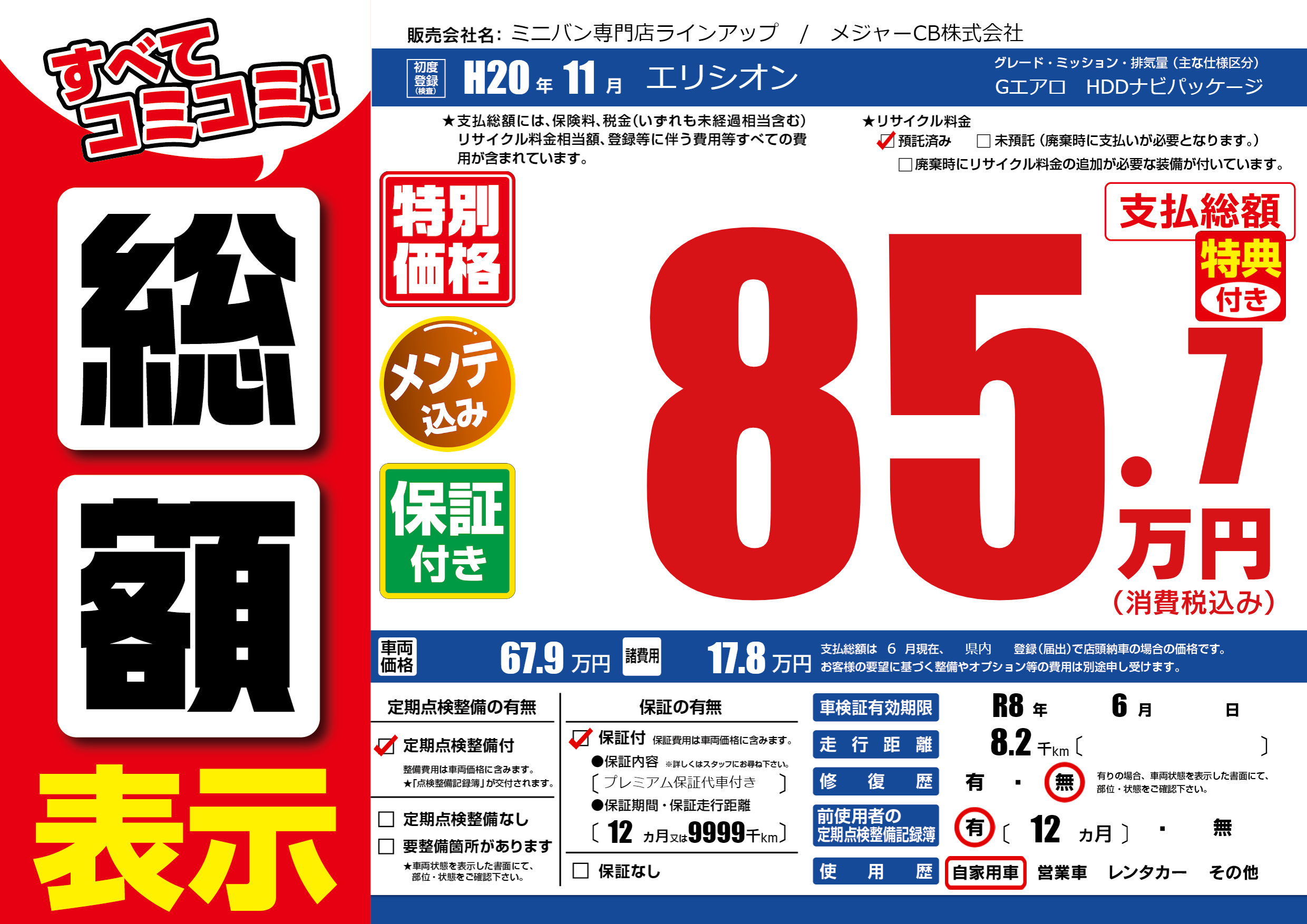 | 走行キロ | 0.8万km | 初年度登録 | H20年11月 |
