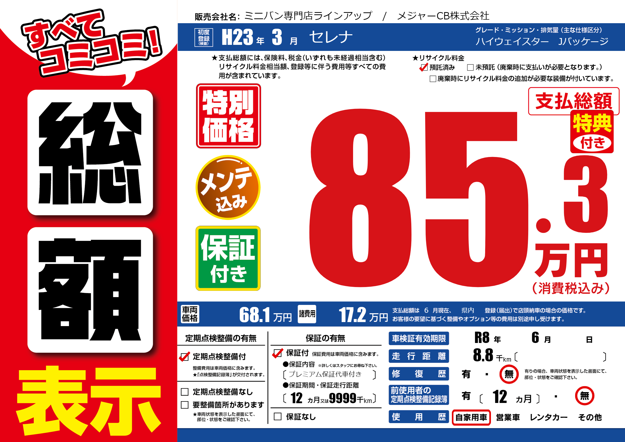 | 走行キロ | 0.8万km | 初年度登録 | H23年3月 |