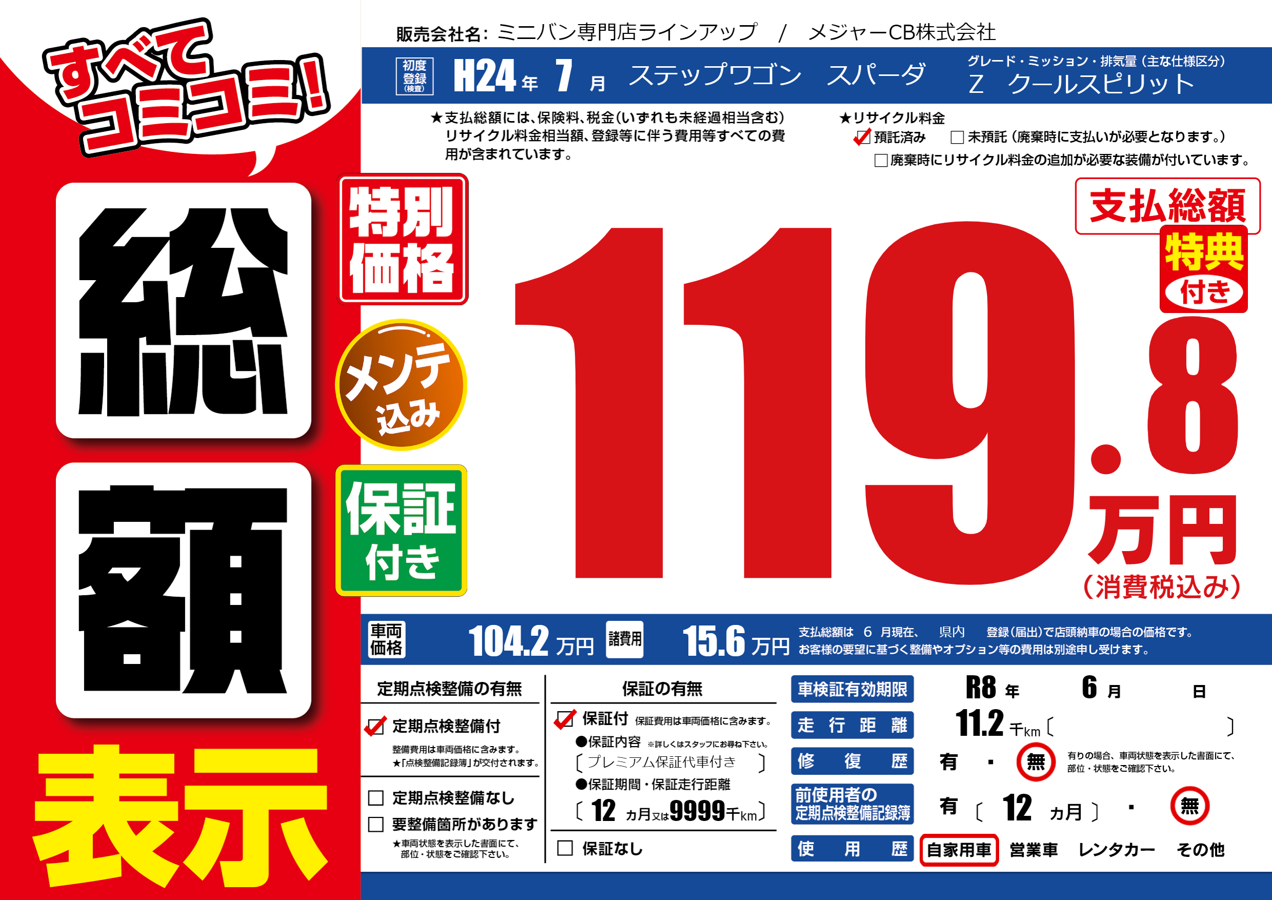 保証付き 保証内容(プレミアム保証代車付き) 12ヶ月または(9999)千kmまで |