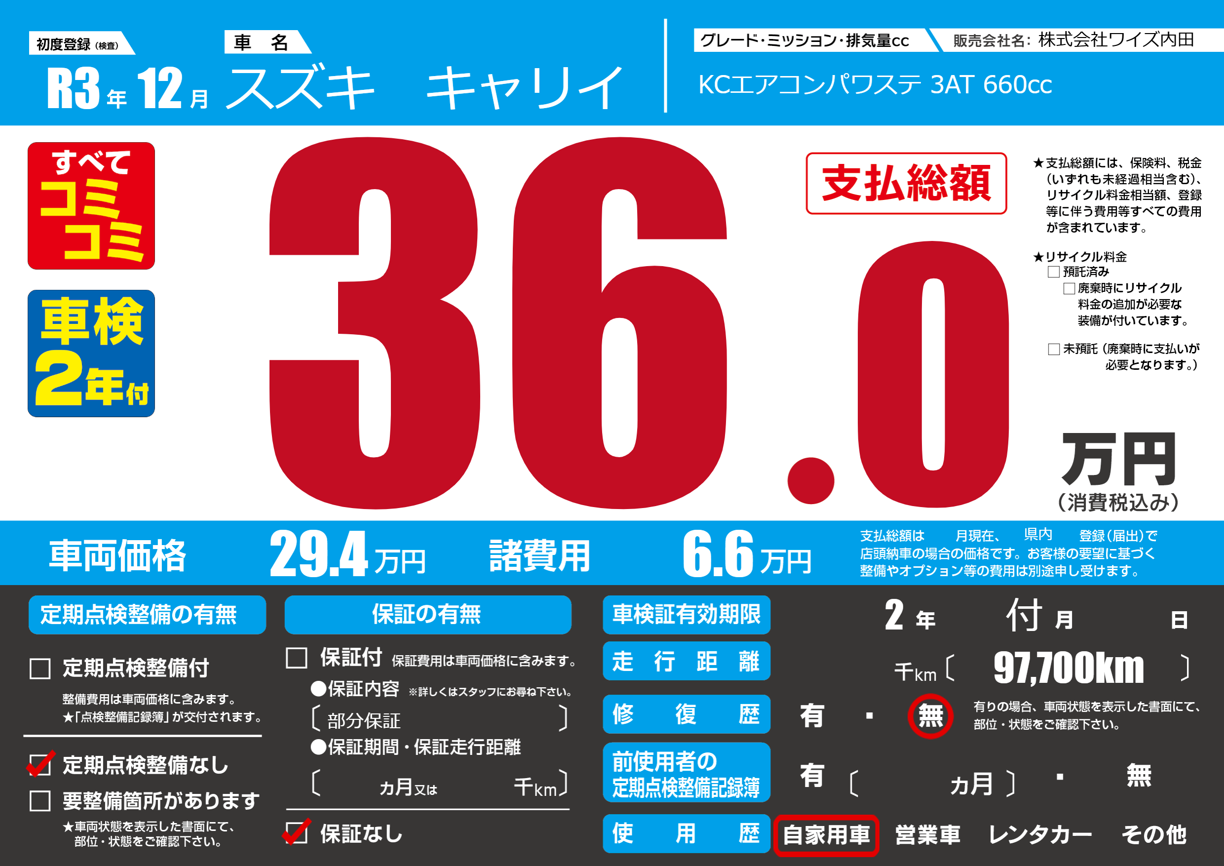 保証なし 保証内容(部分保証) ---ヶ月または()千kmまで |