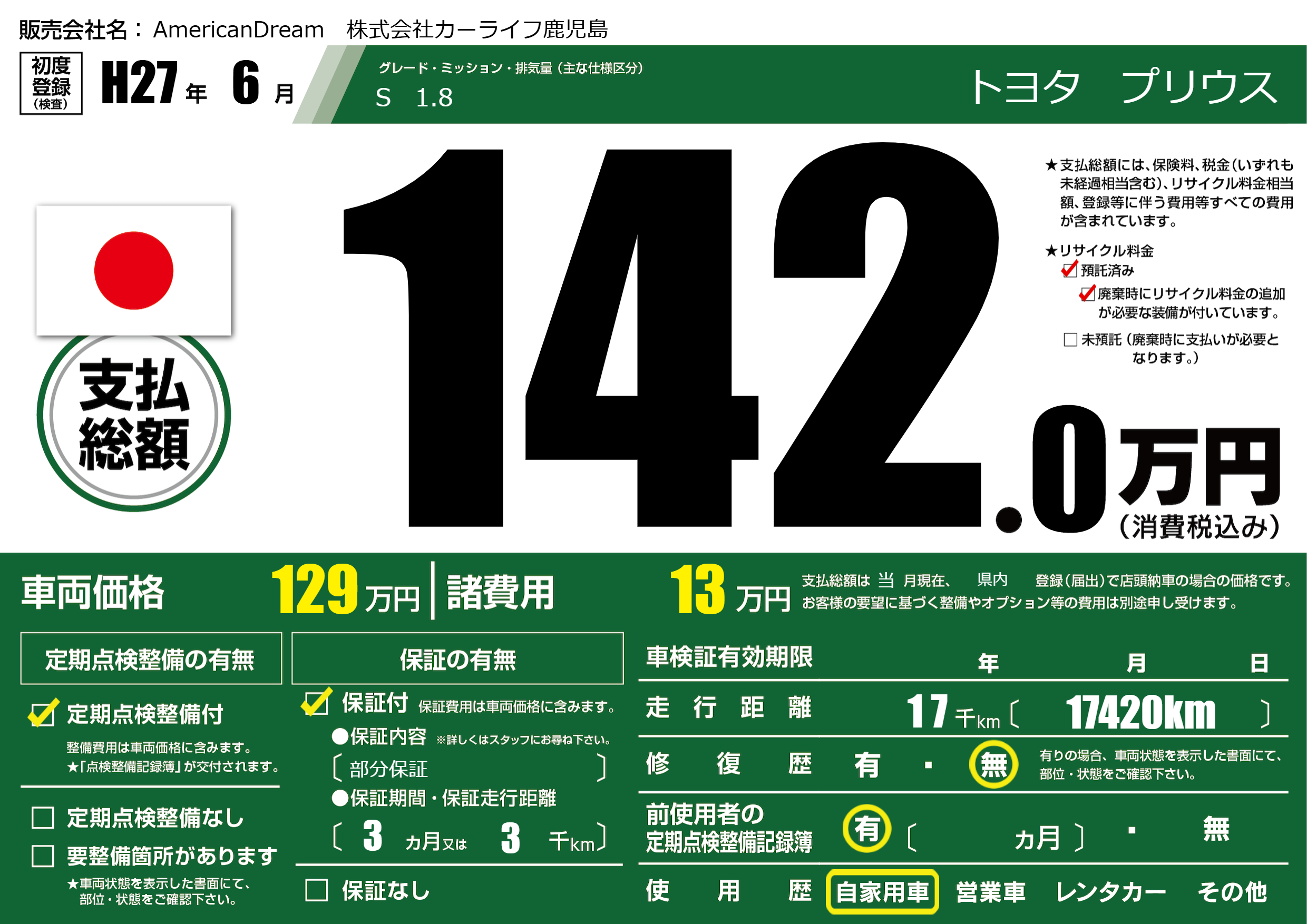 | 車名 | トヨタ プリウス | グレード ミッション 排気量 |