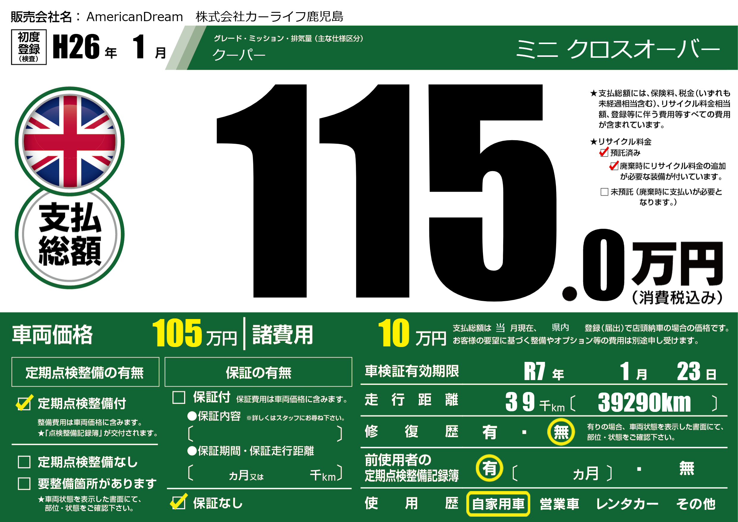 | 車名 | ミニ クロスオーバー | グレード ミッション 排気量 |