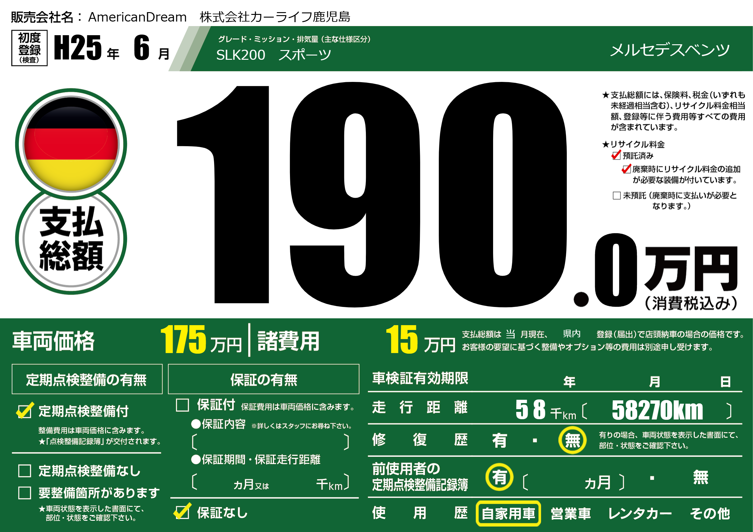 | 車名 | メルセデスベンツ | グレード ミッション 排気量 |