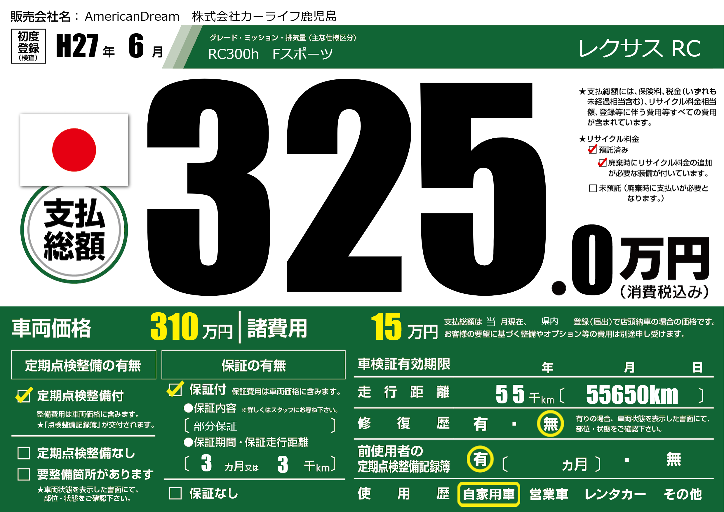 | 車名 | レクサス RC | グレード ミッション 排気量 |