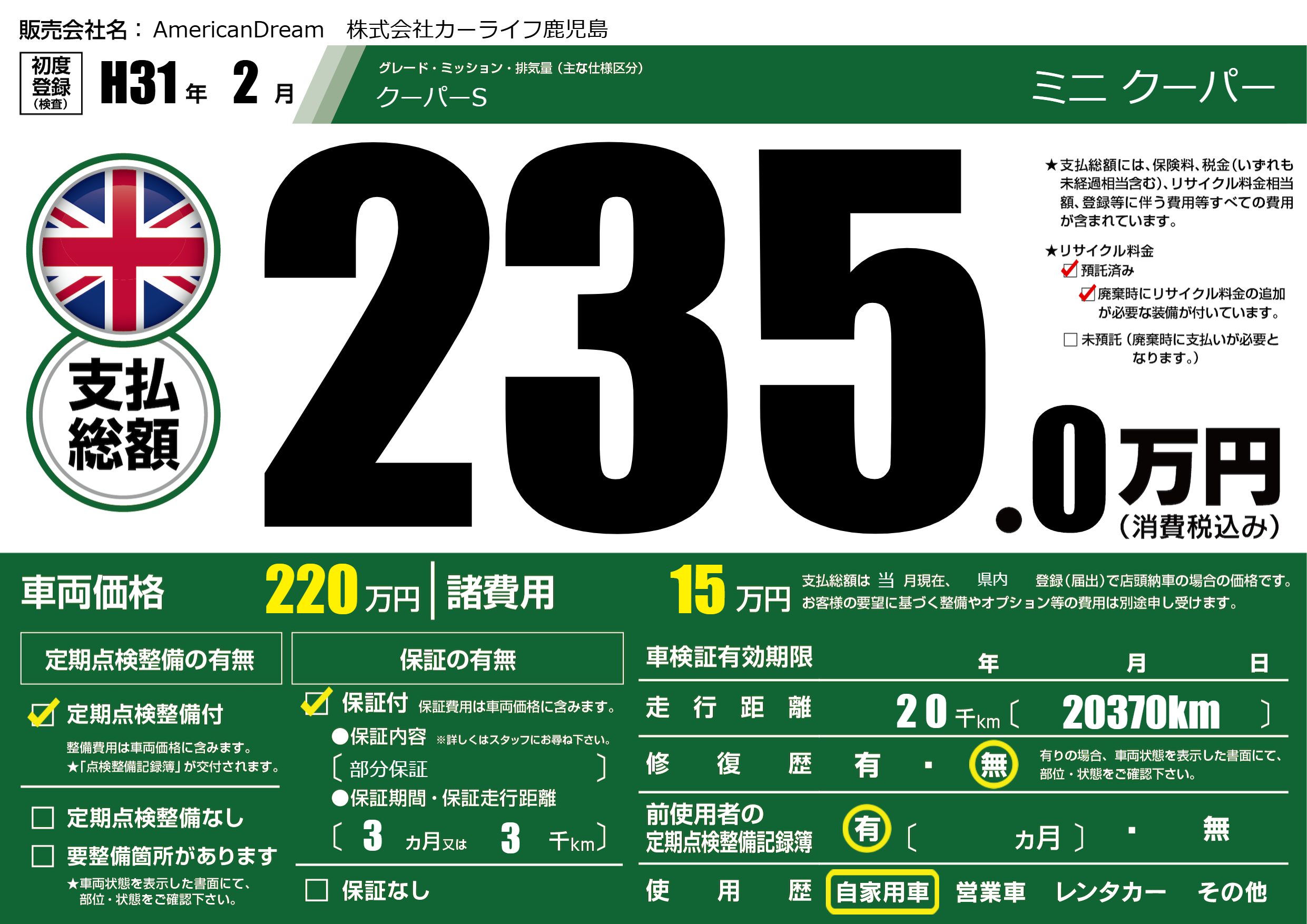 | 車名 | ミニ クーパー | グレード ミッション 排気量 |