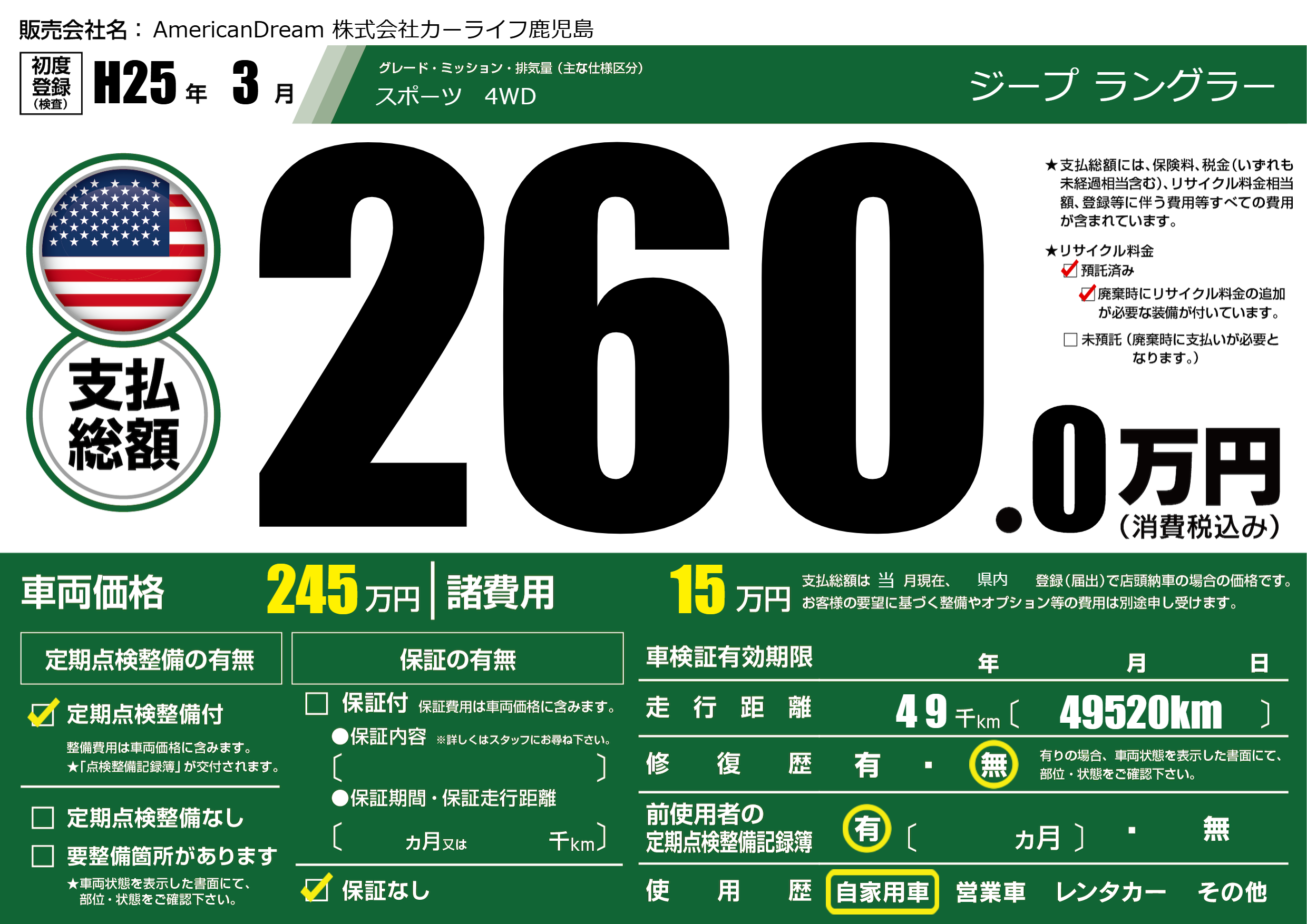 | 車名 | ジープ ラングラー | グレード ミッション 排気量 |