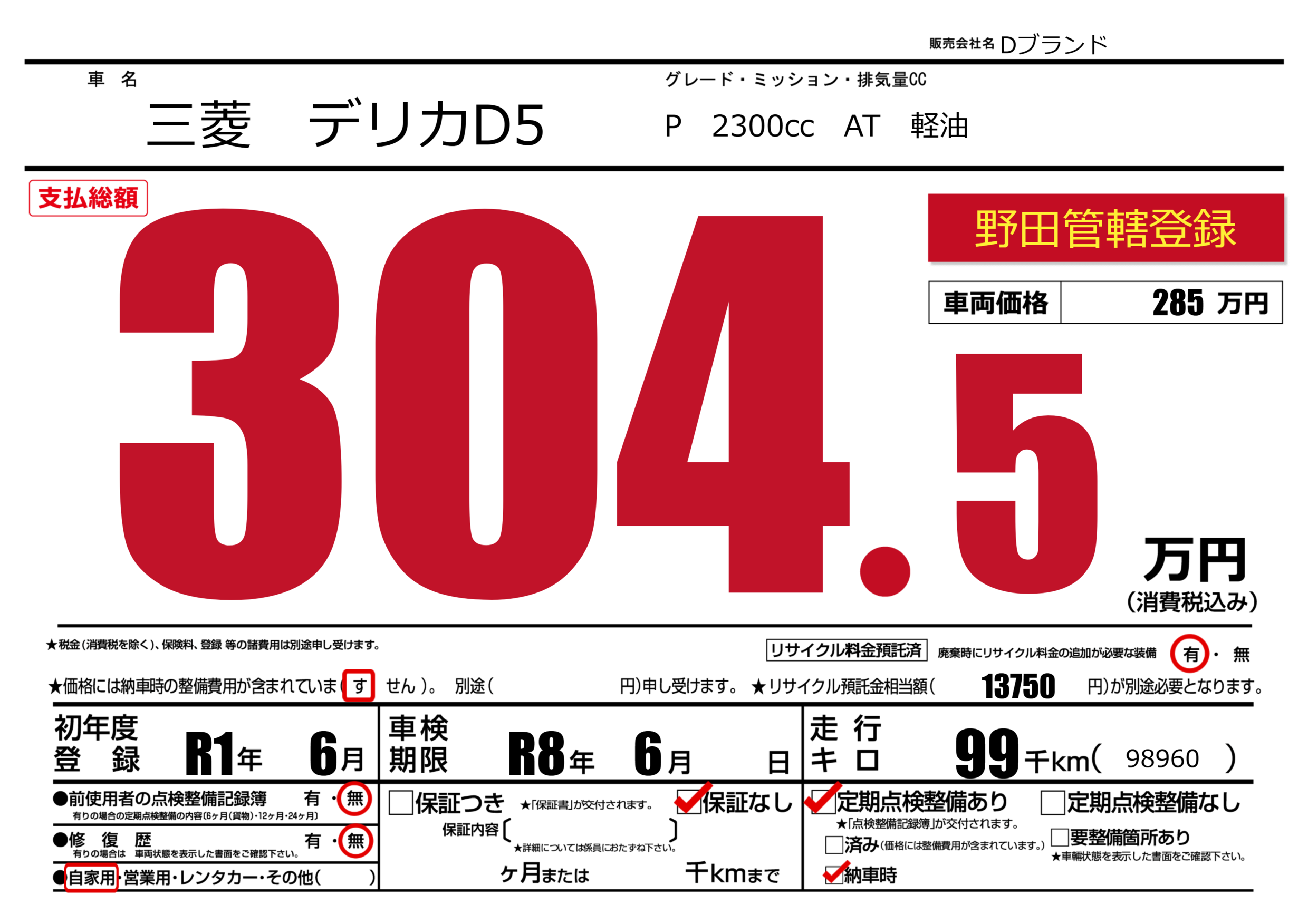 | 車名 | 三菱 デリカD5 | グレード ミッション 排気量 |