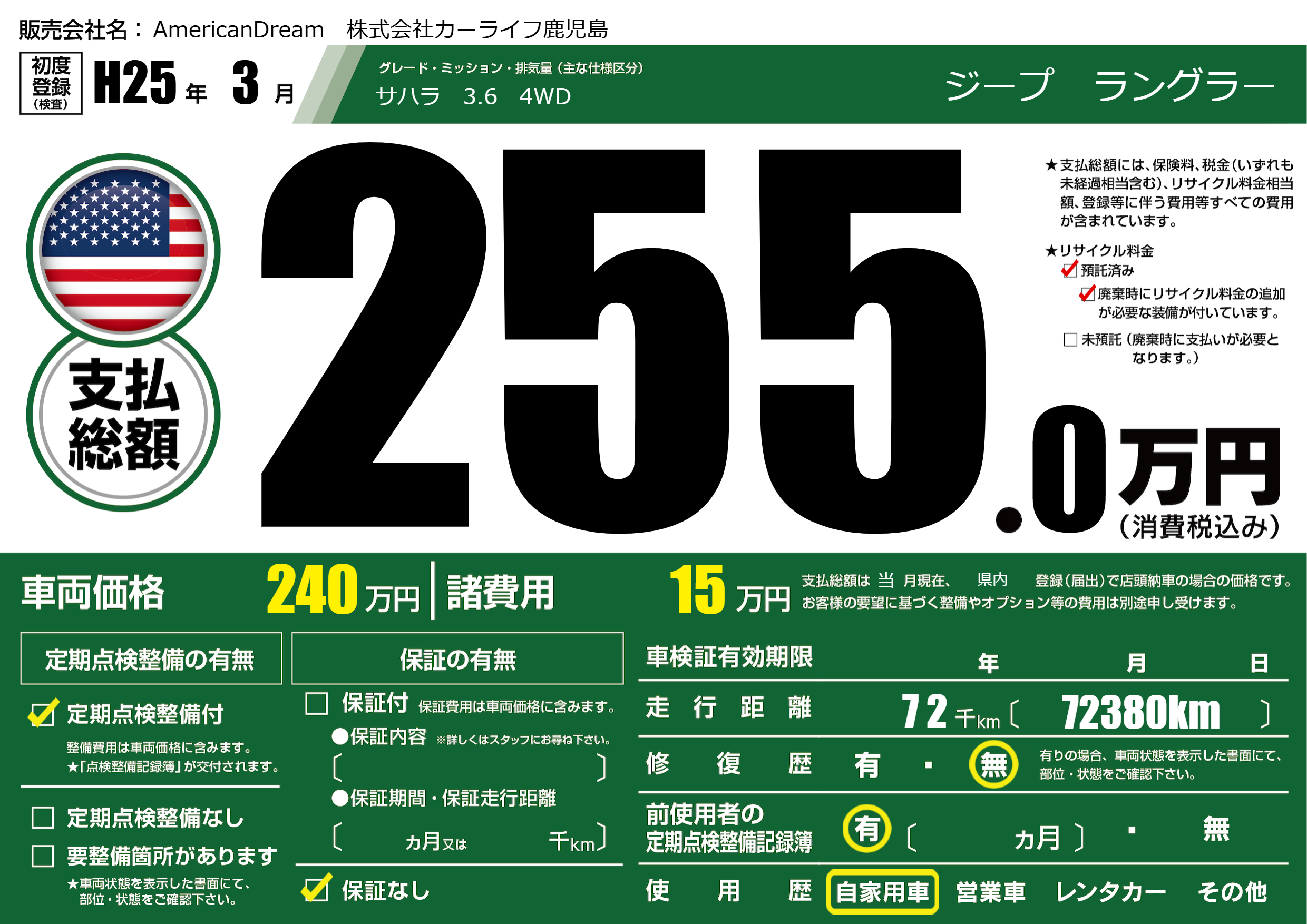 あり | リサイクル預託金相当額 | ( 0円)が別途必要 |