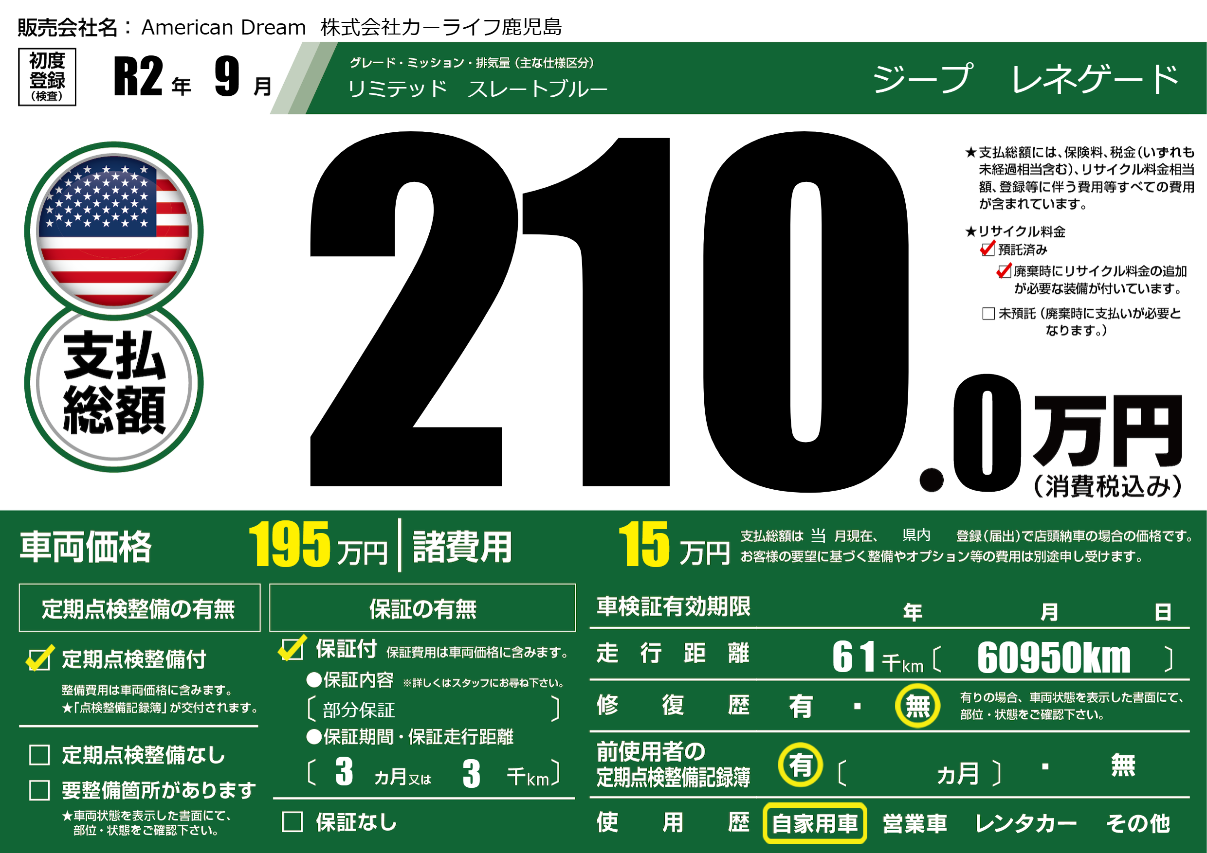 | 車名 | ジープ レネゲード | グレード ミッション 排気量 |