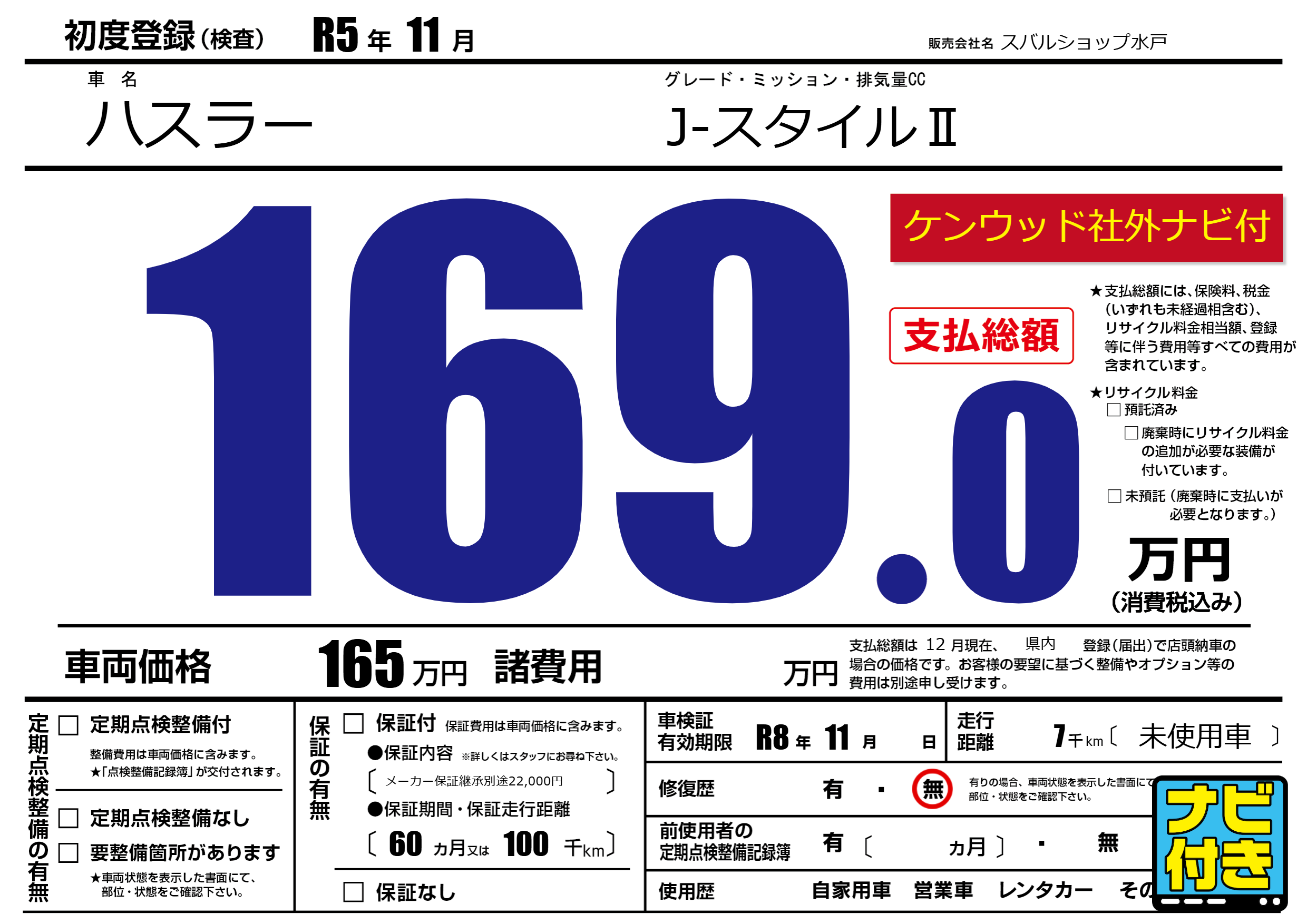 | 走行キロ | 0.7万km | 初年度登録 | R5年11月 |