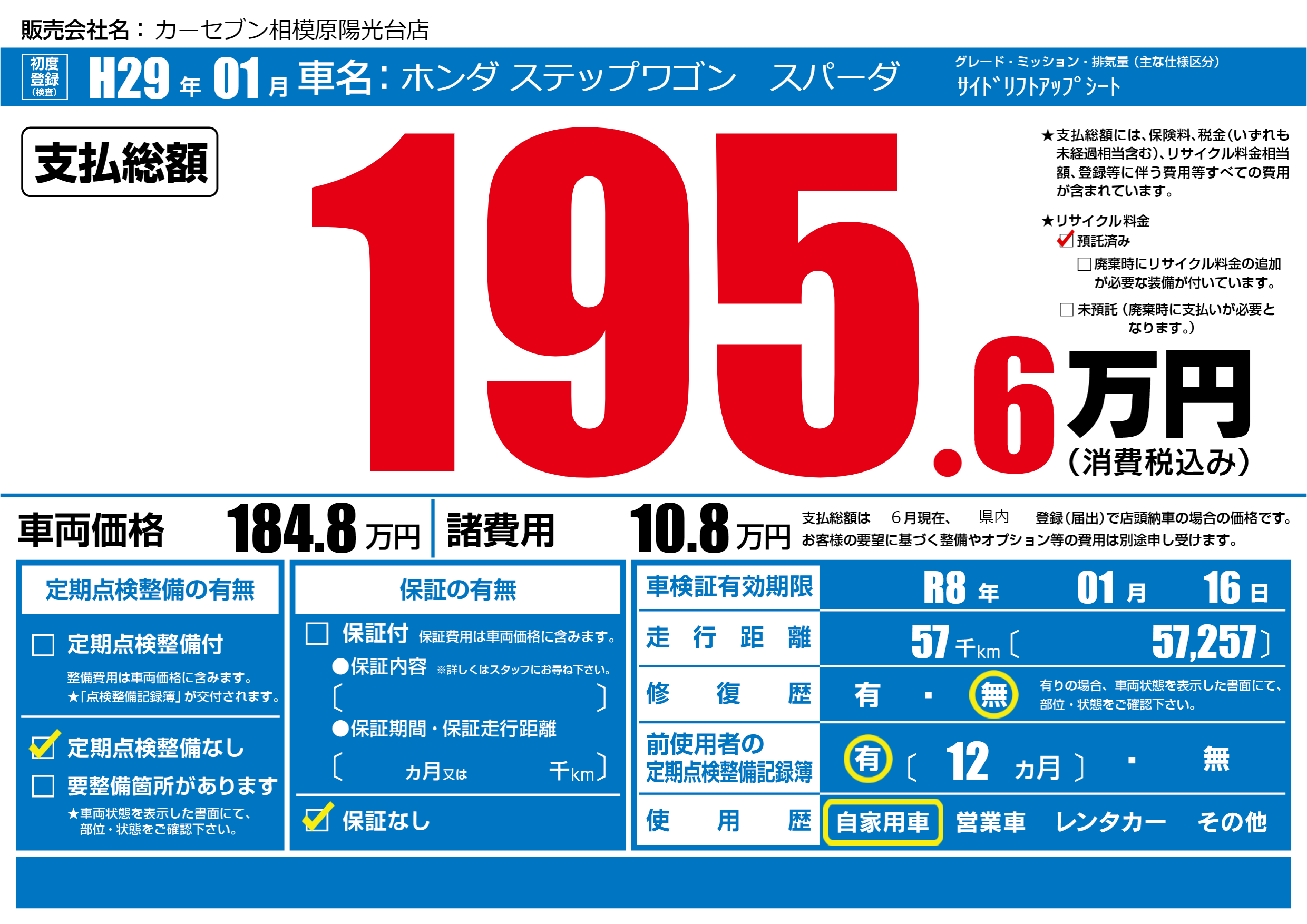 | 車名 | ホンダ ステップワゴン スパーダ | グレード ミッション 排気量 |