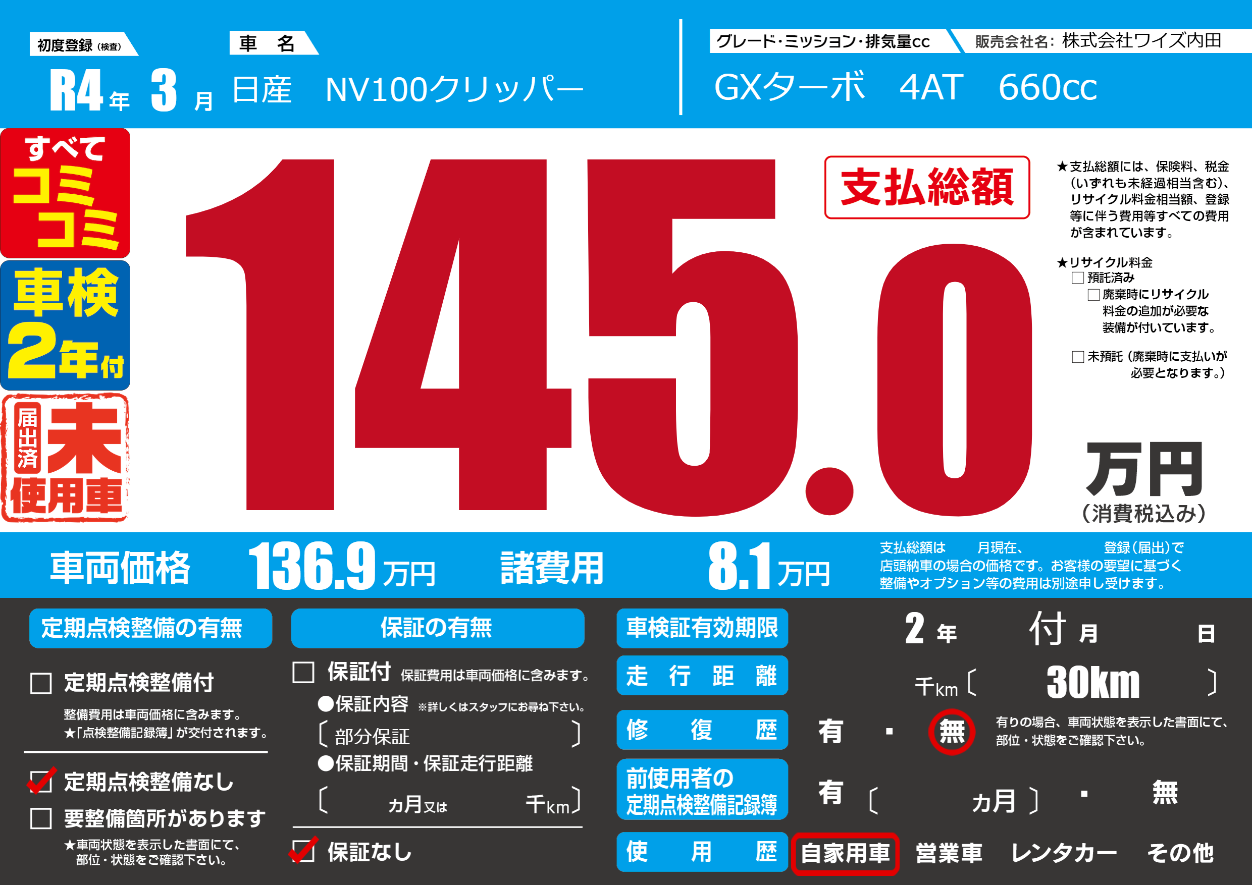 保証なし 保証内容(部分保証) ---ヶ月または()千kmまで |