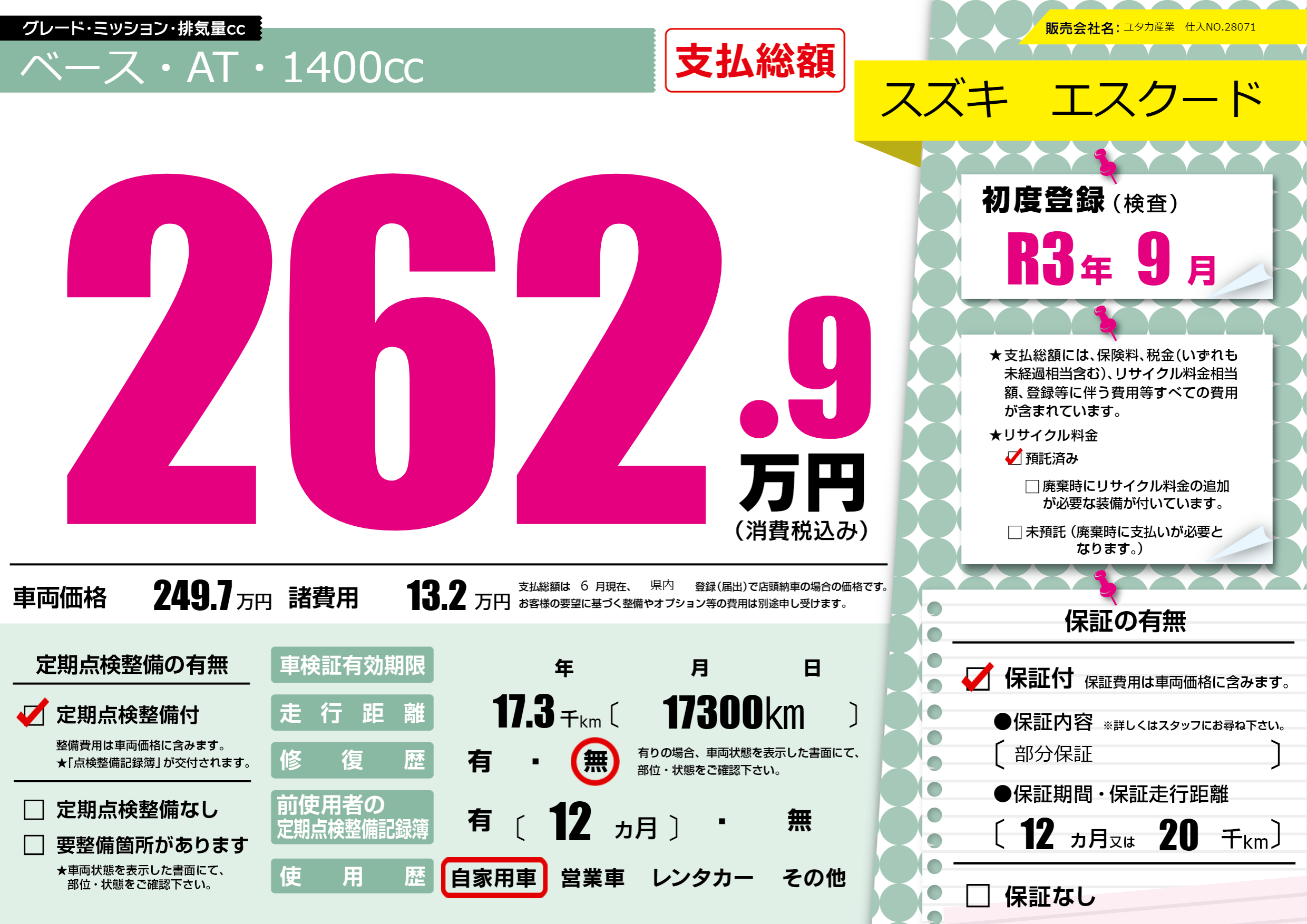 | 走行キロ | 1.7万km | 初年度登録 | R3年9月 |