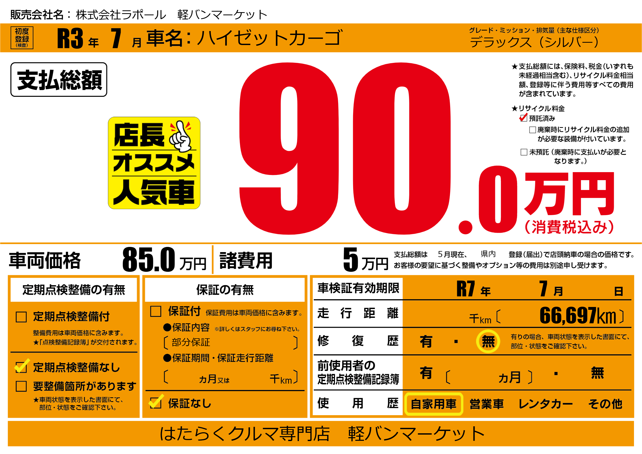 | 車名 | ハイゼットカーゴ | グレード ミッション 排気量 |