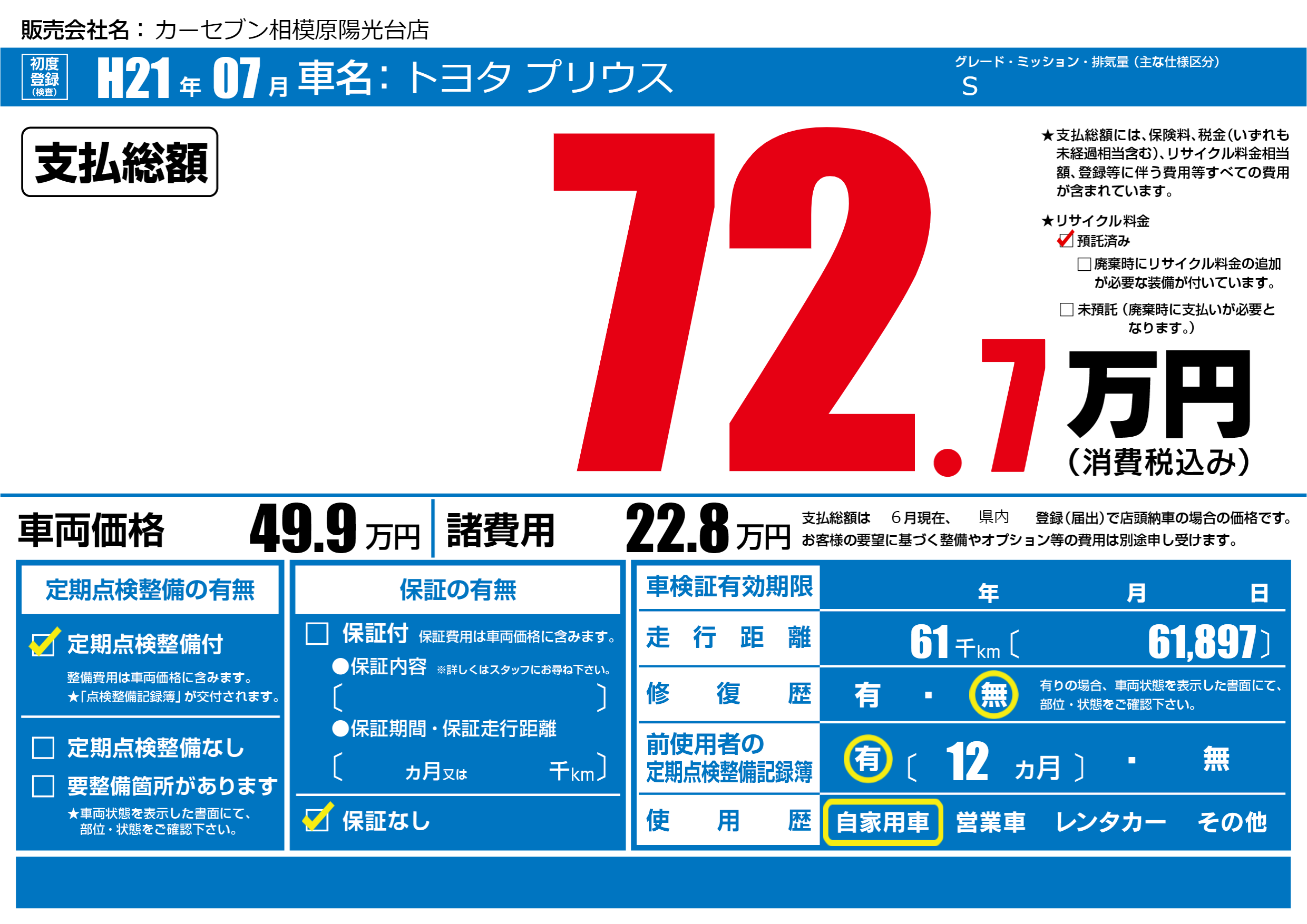 | 車名 | トヨタ プリウス | グレード ミッション 排気量 |