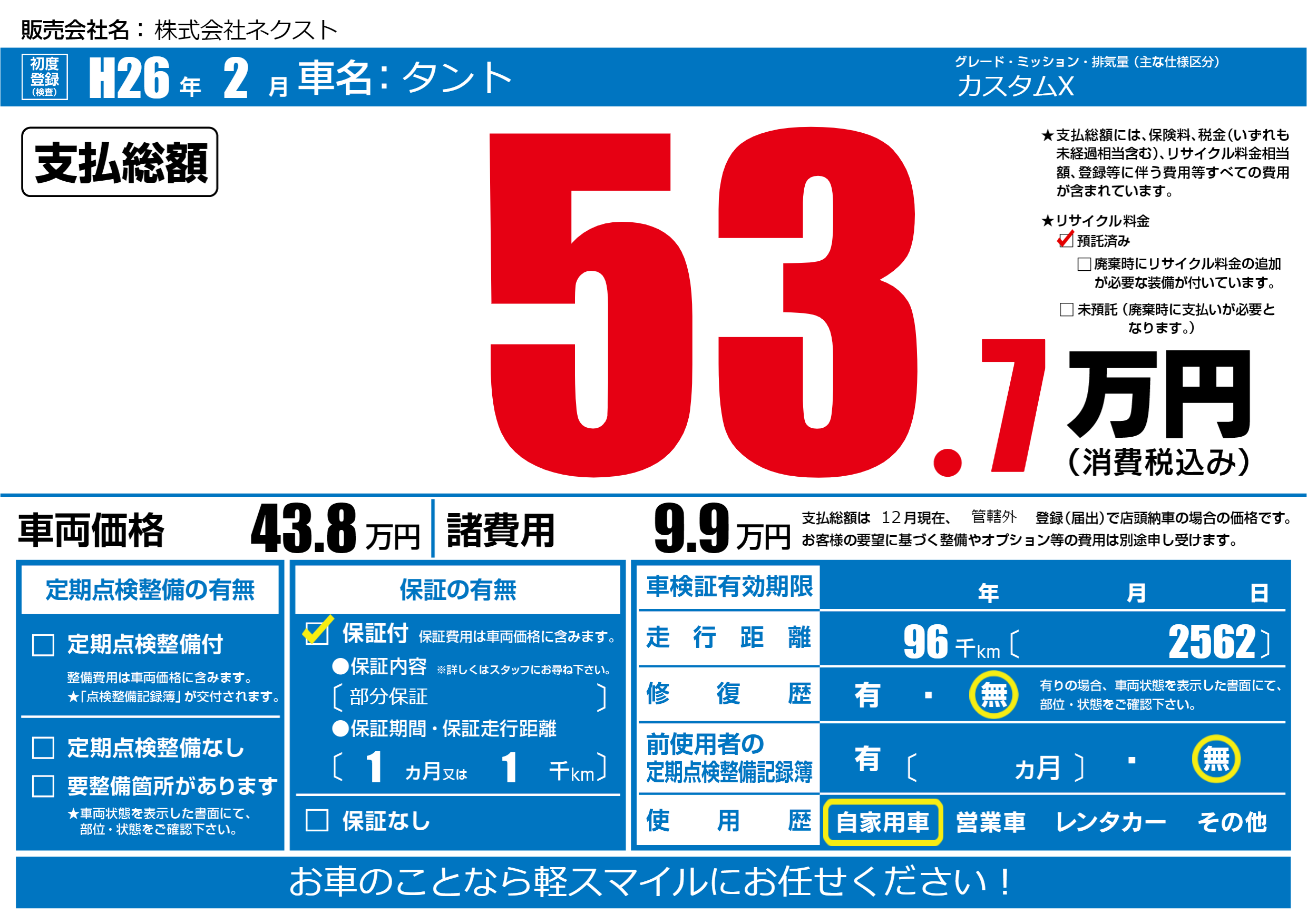 | 走行キロ | 9.6万km | 初年度登録 | H26年2月 |