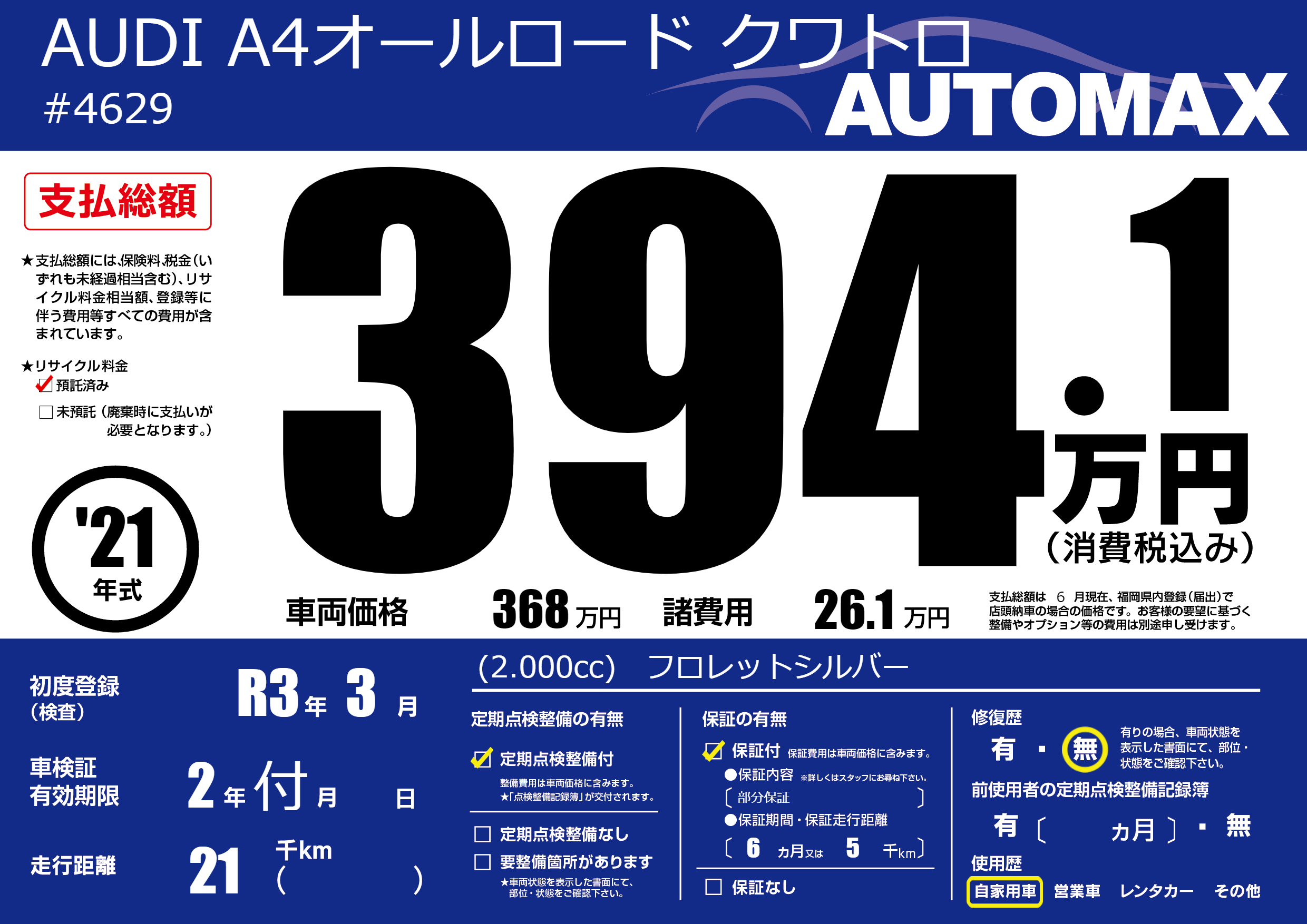 | 車名 | AUDI A4オールロード クワトロ | グレード ミッション 排気量 |