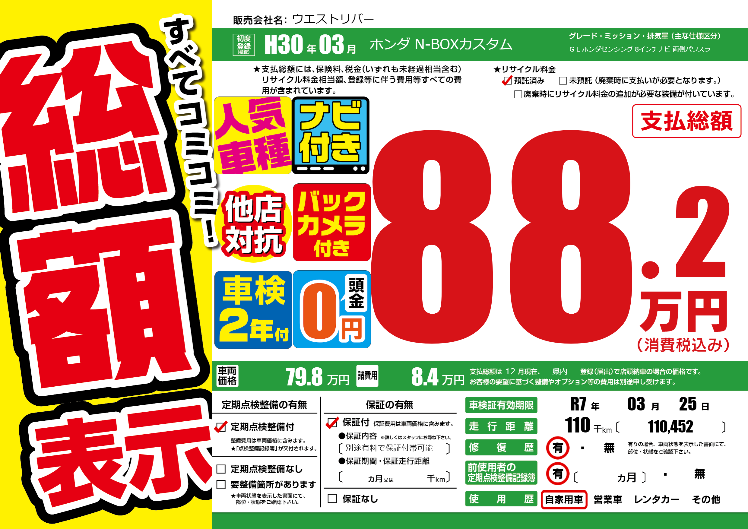 | 走行キロ | 11万km | 初年度登録 | H30年03月 |