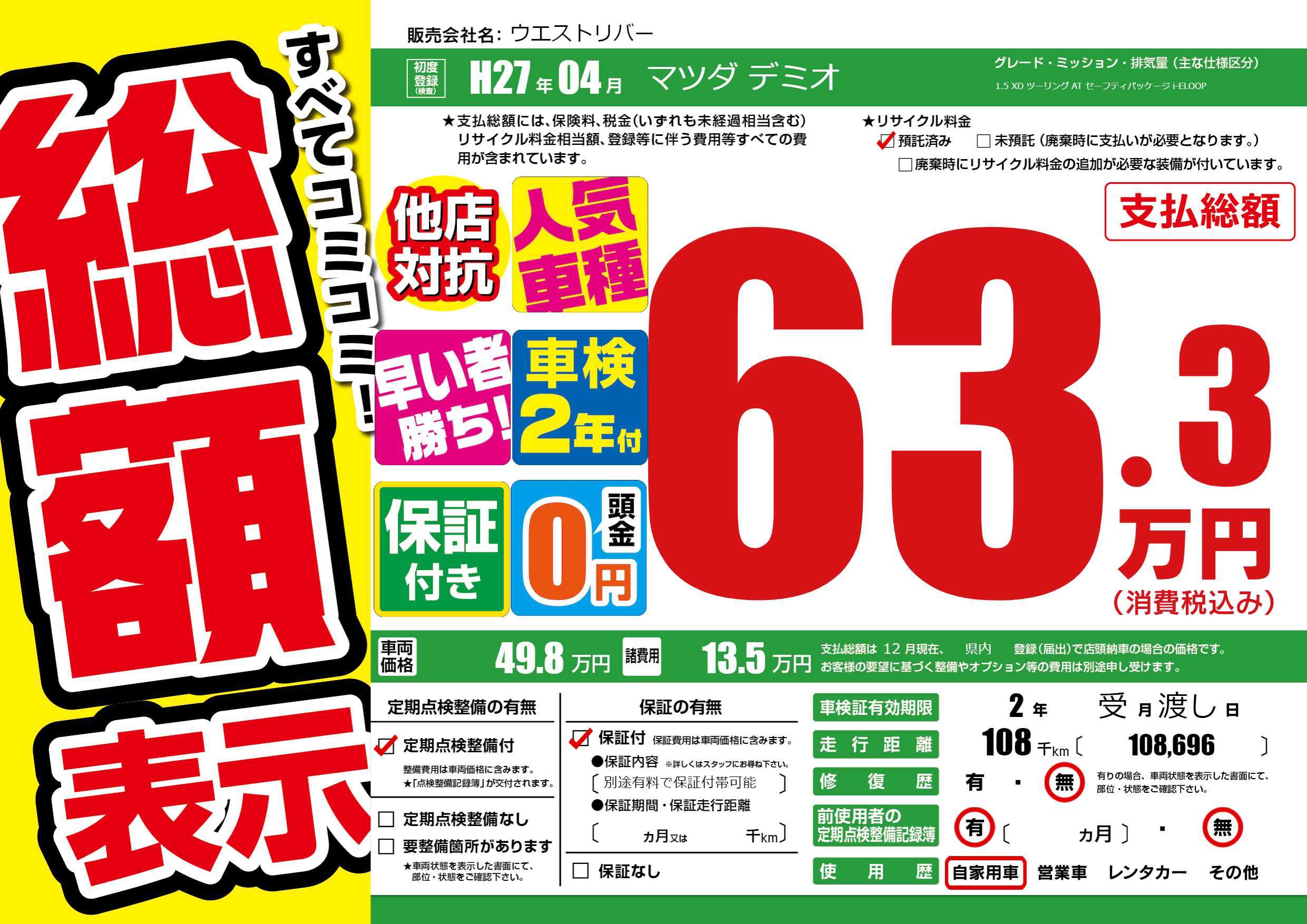 | 車名 | マツダ デミオ | グレード ミッション 排気量 |