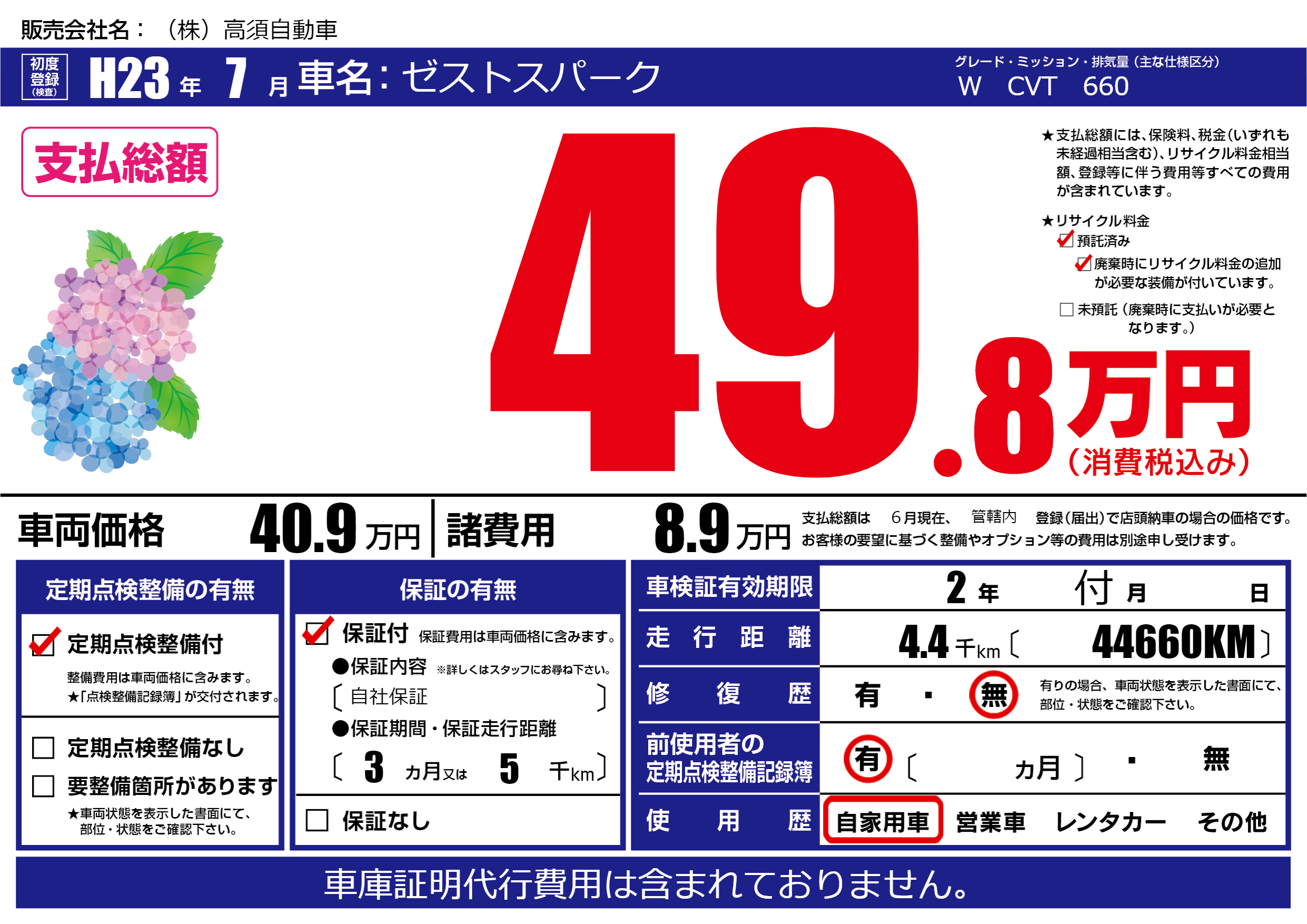 あり | リサイクル預託金相当額 | ( 0円)が別途必要 |