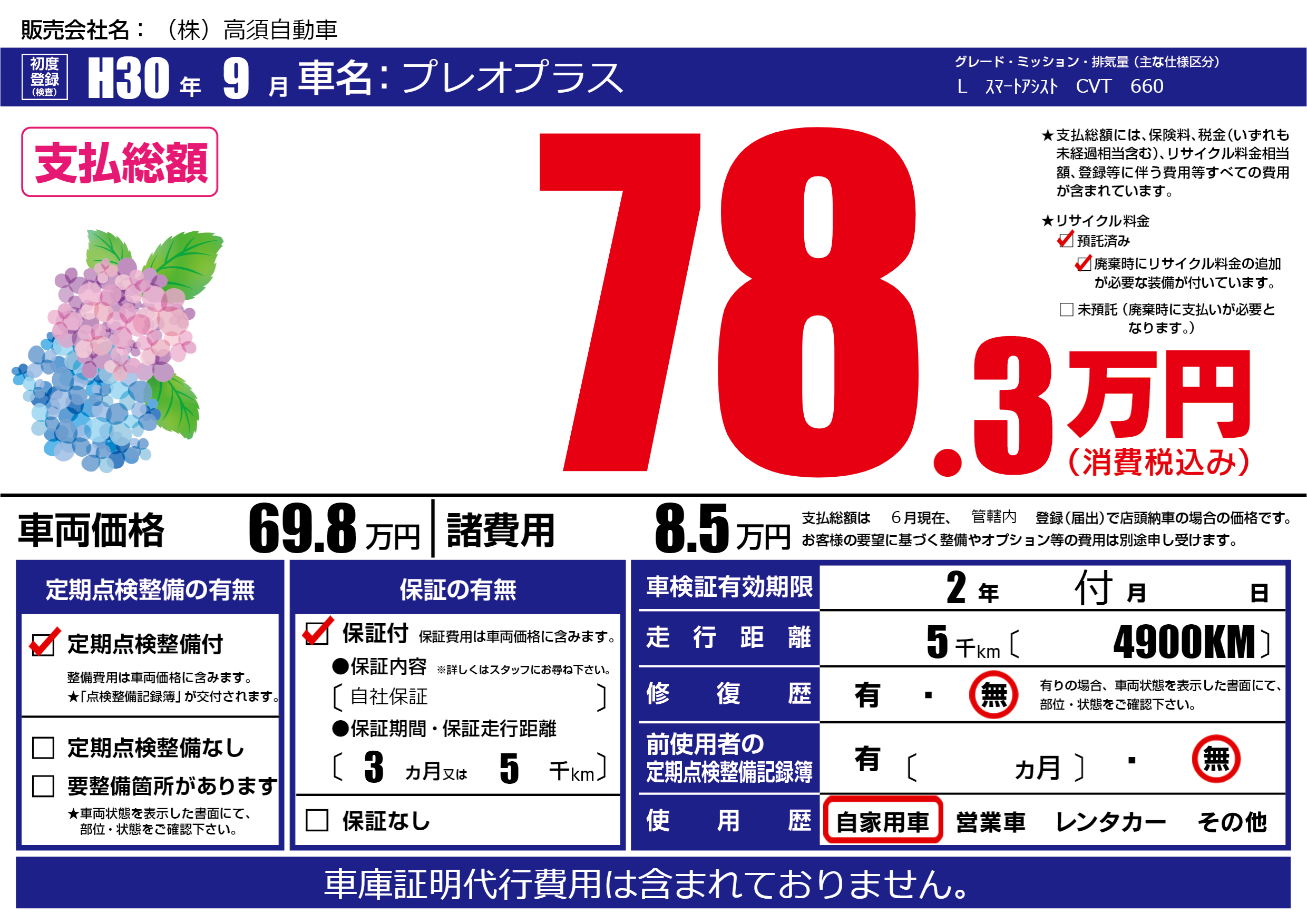 保証付き 保証内容(自社保証) 3ヶ月または(5)千kmまで |