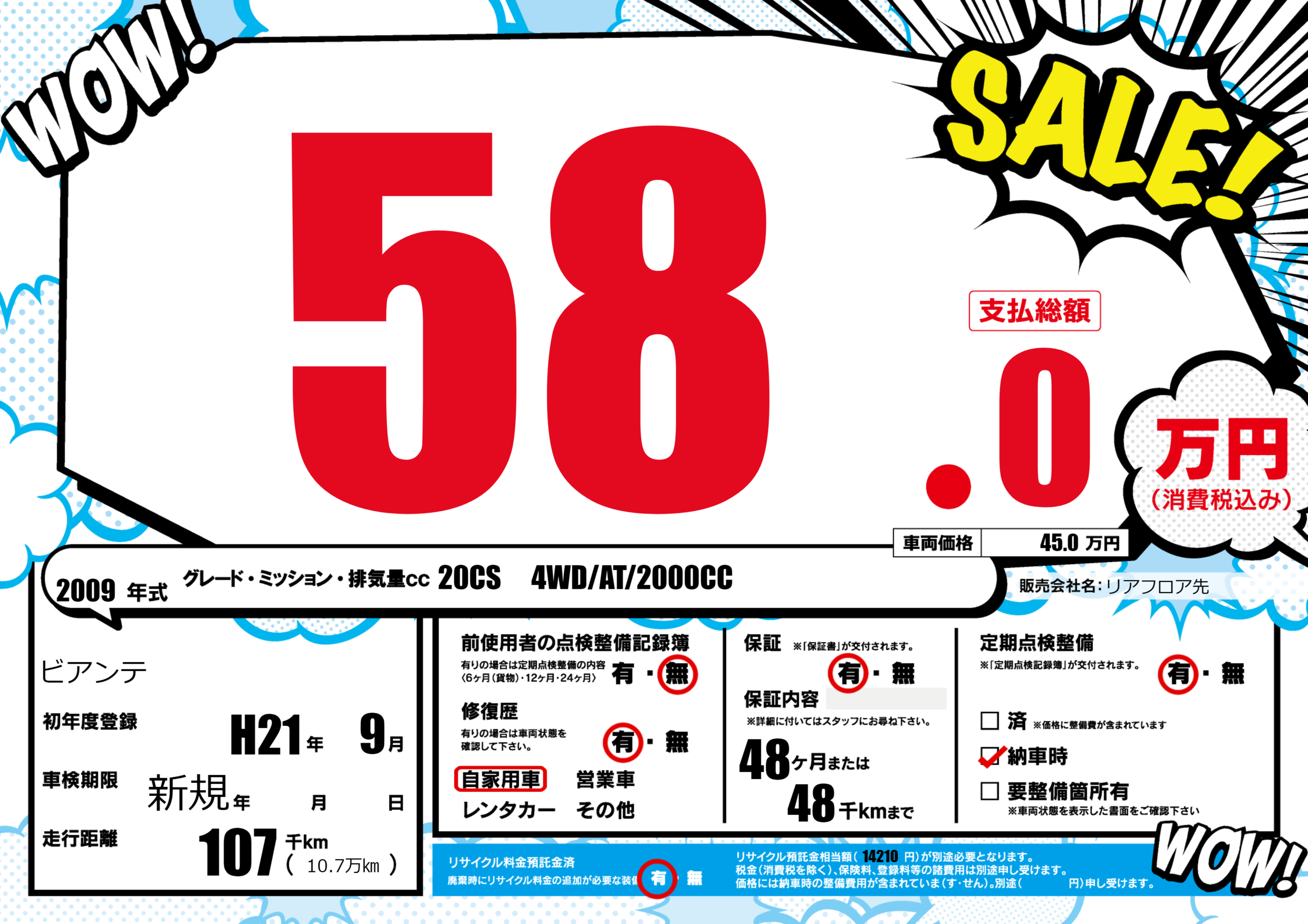 | 車名 | ビアンテ | グレード ミッション 排気量 |