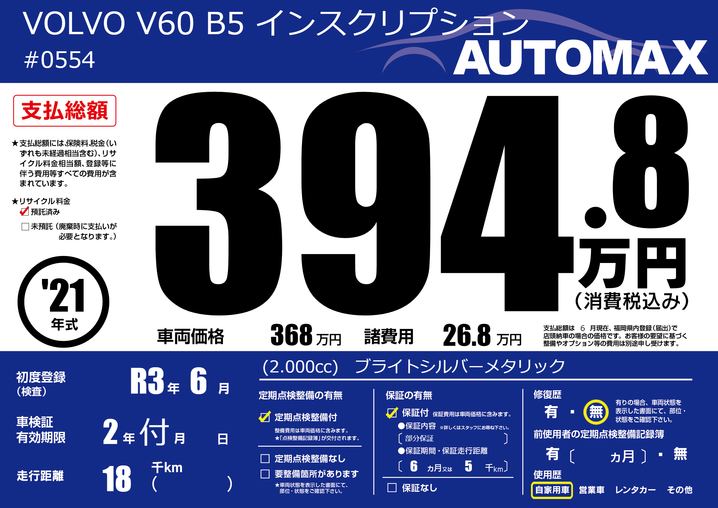 | 車名 | VOLVO V60 B5 インスクリプション | グレード ミッション 排気量 |