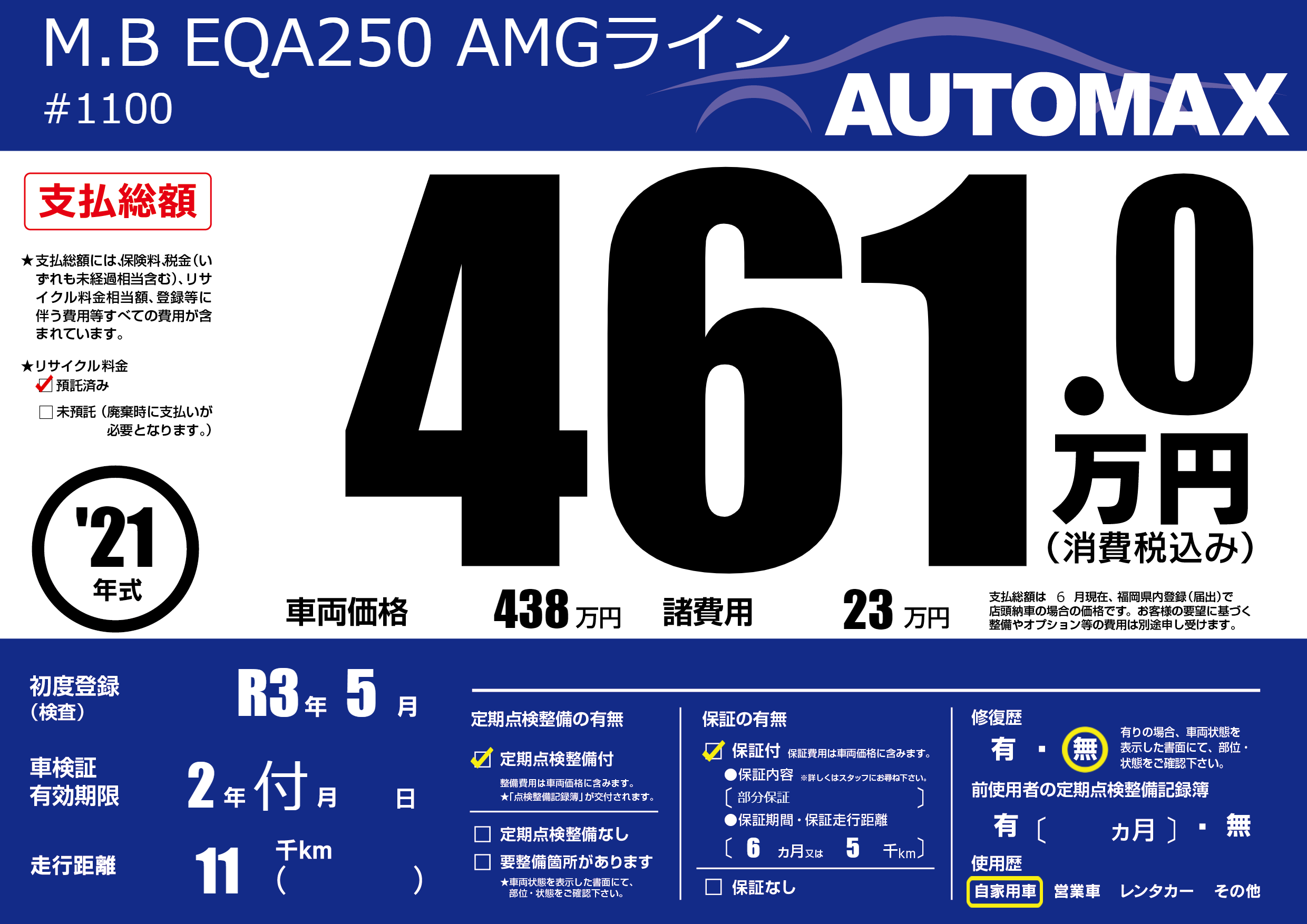 | 車名 | M.B EQA250 AMGライン | グレード ミッション 排気量 |