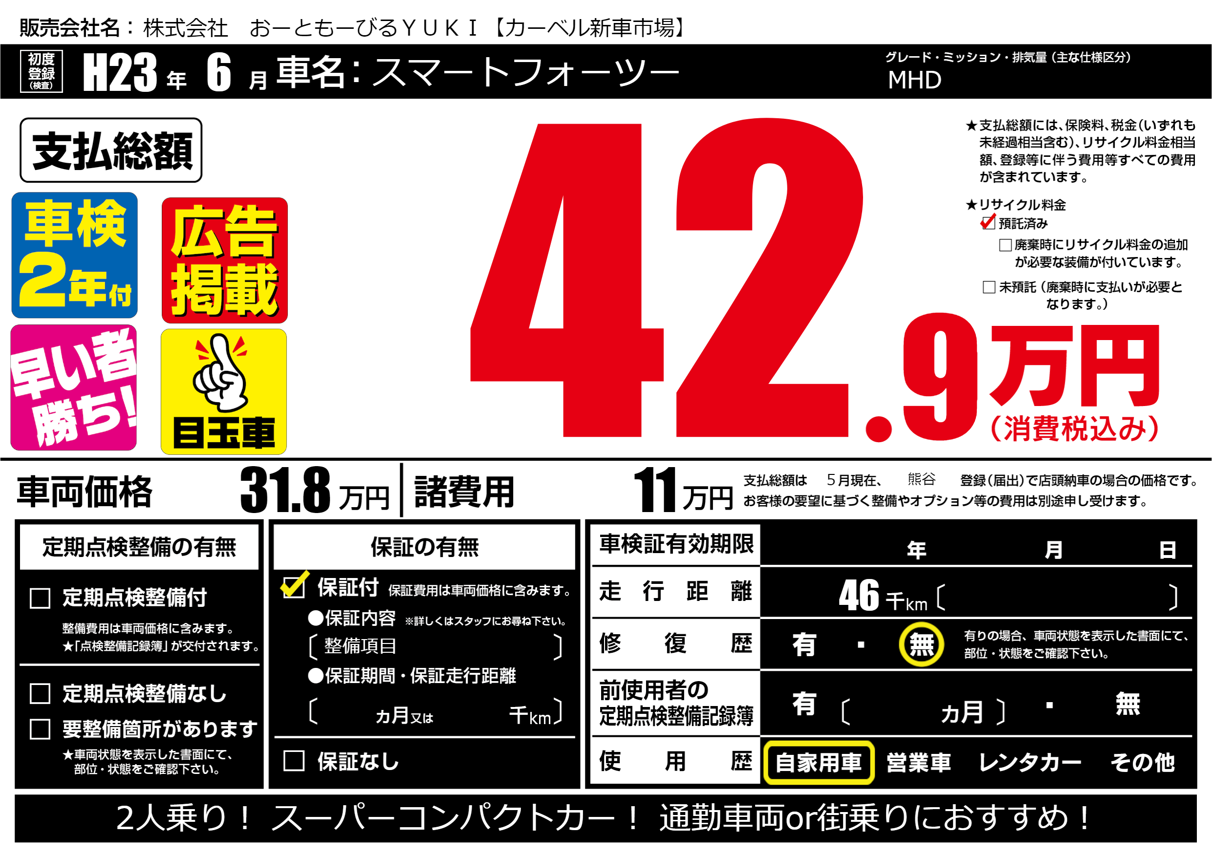 | 車名 | スマートフォーツー | グレード ミッション 排気量 |