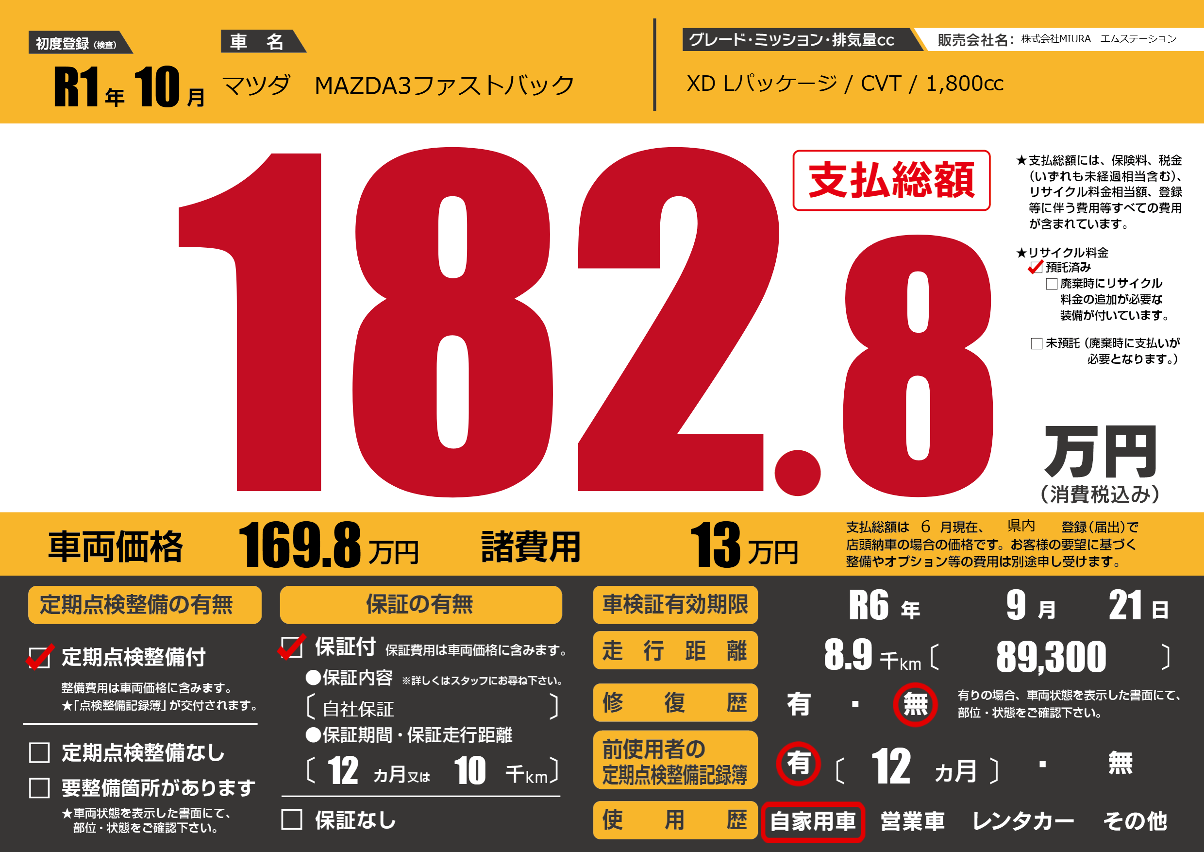 | 車名 | マツダ MAZDA3ファストバック | グレード ミッション 排気量 |