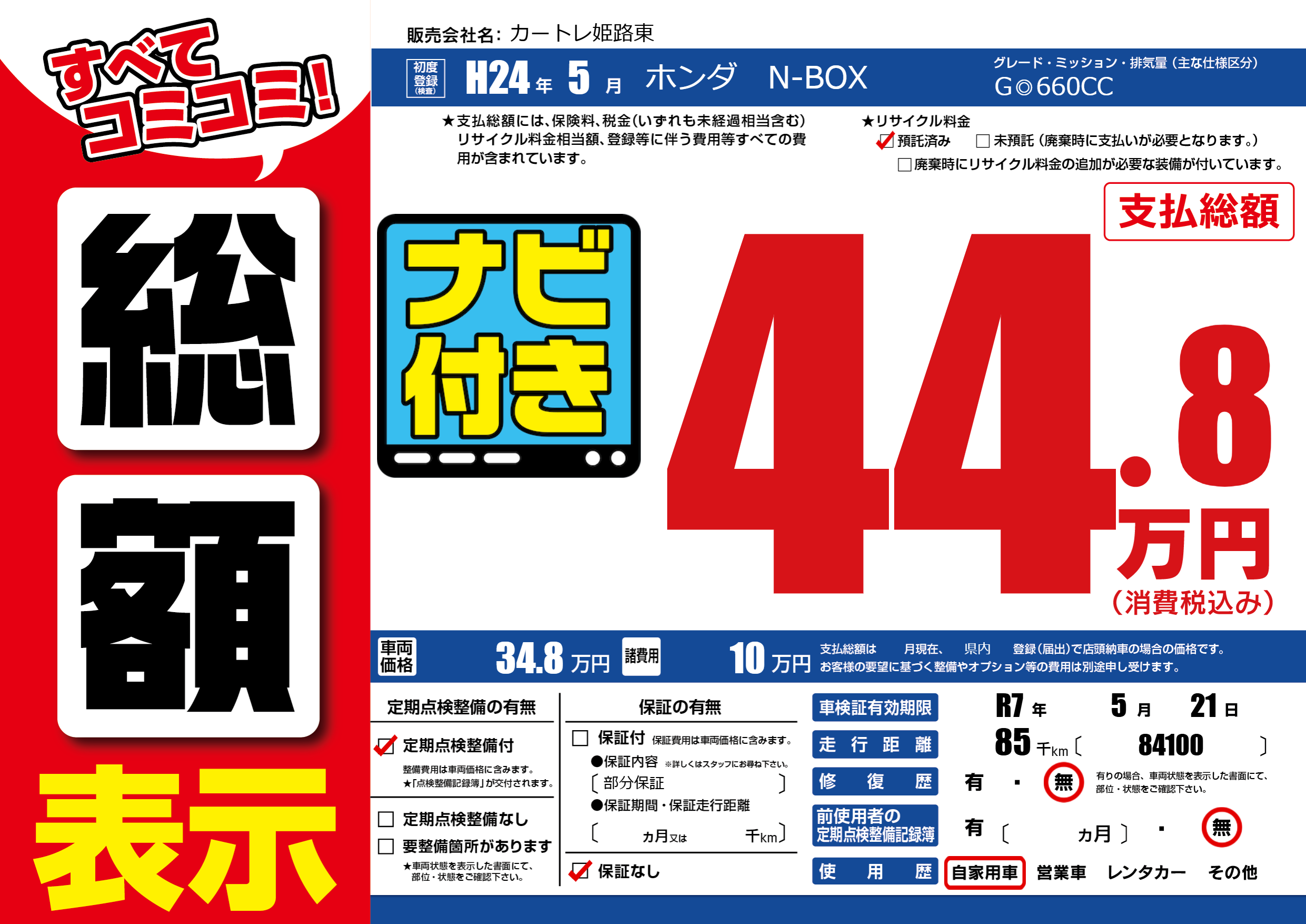 | 車名 | ホンダ N-BOX | グレード ミッション 排気量 |