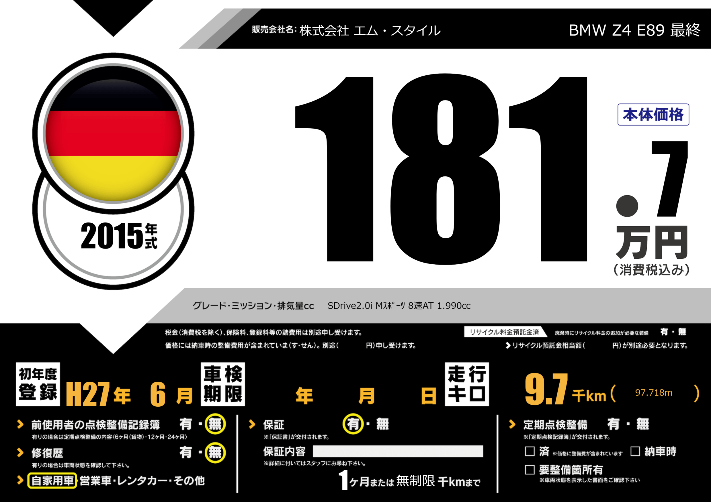 | 車名 | BMW Z4 E89 最終 | グレード ミッション 排気量 |