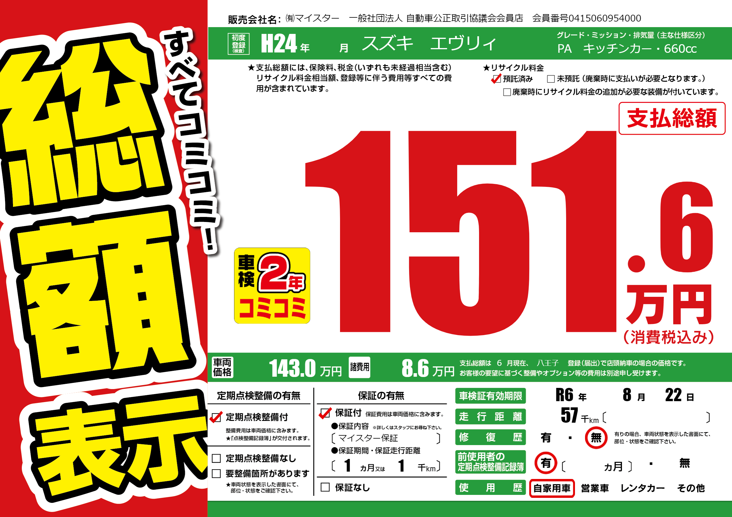 | 車名 | スズキ エヴリィ | グレード ミッション 排気量 |