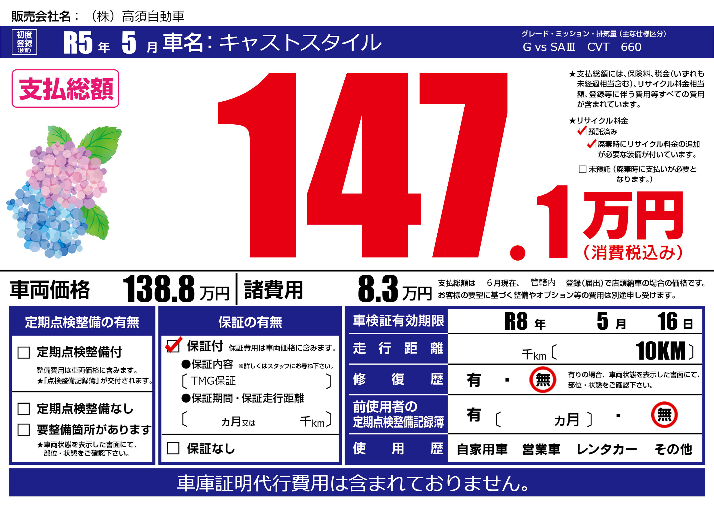 保証付き 保証内容(TMG保証) ---ヶ月または()千kmまで |